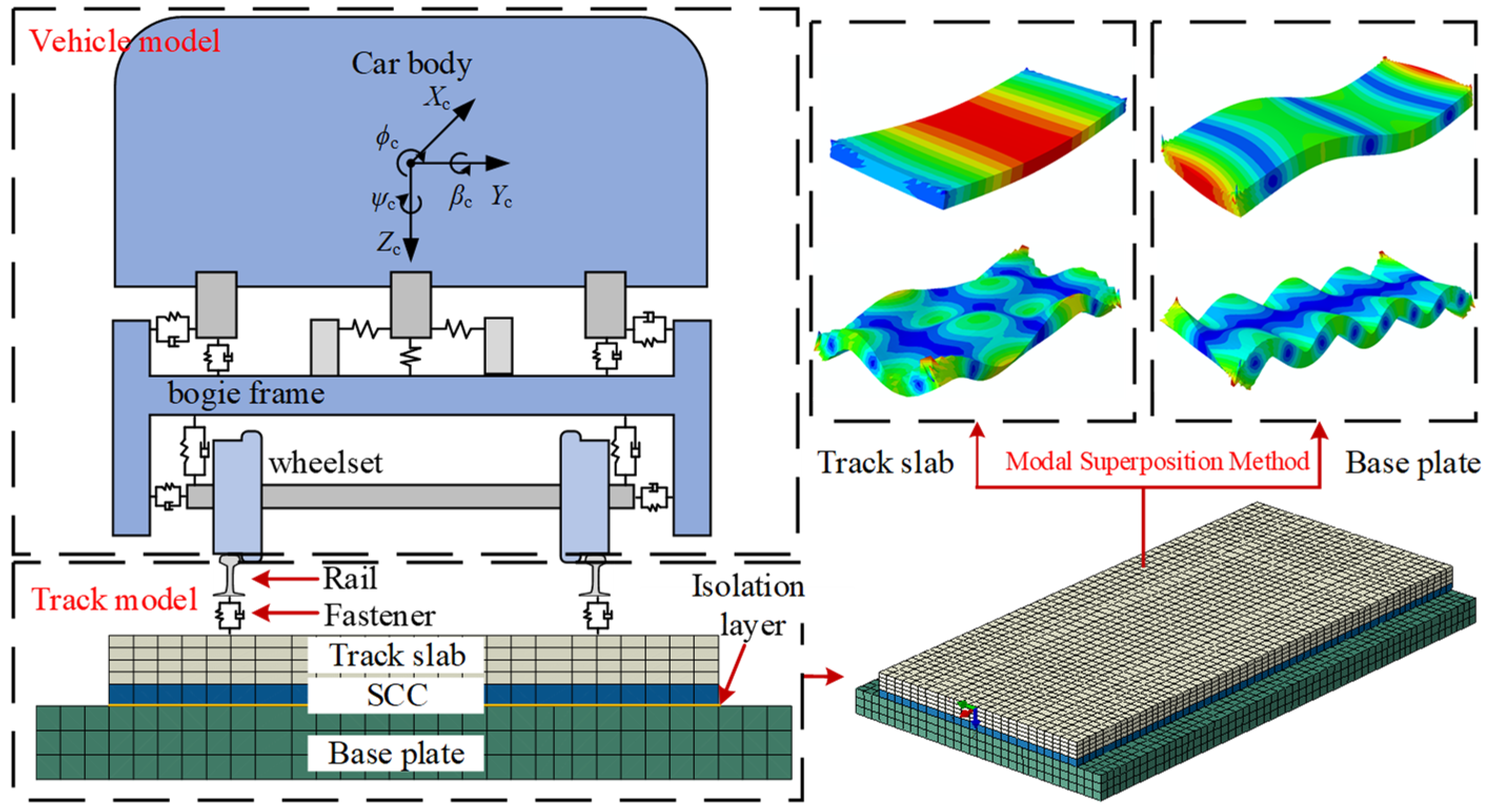 The CRTS III ballastless track consists of a track slab, self-compacting concrete (SCC), an isolation layer, and a base plate. The track slab and SCC are poured integrally to form a composite slab. In the dynamic model, the vibrations of both the composite slab and the base plate are explicitly considered, while the isolation layer is simplified as a linear spring–damper element. The composite slab is solved using the modal superposition method, which significantly reduces the computational degrees of freedom within the same analysis frequency range. First, the free-vibration modal parameters of the composite slab are obtained from the finite element model. The dynamic governing equation in modal space is then formulated as: