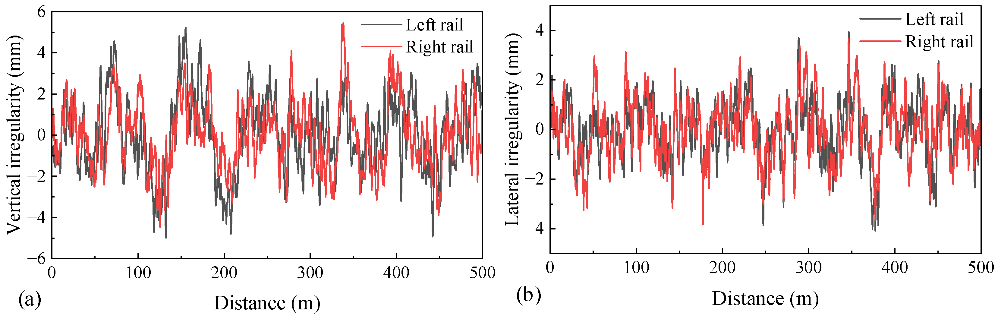 Track irregularities constitute the dominant excitation source of vehicle–track coupled vibration. To obtain dynamic responses that better reflect practical operating conditions, the track irregularity adopted in this study is composed of the measured long-wave irregularity recorded by a track inspection vehicle and the Sato roughness spectrum. Time domain samples are generated using an inverse Fourier transform, as shown in
