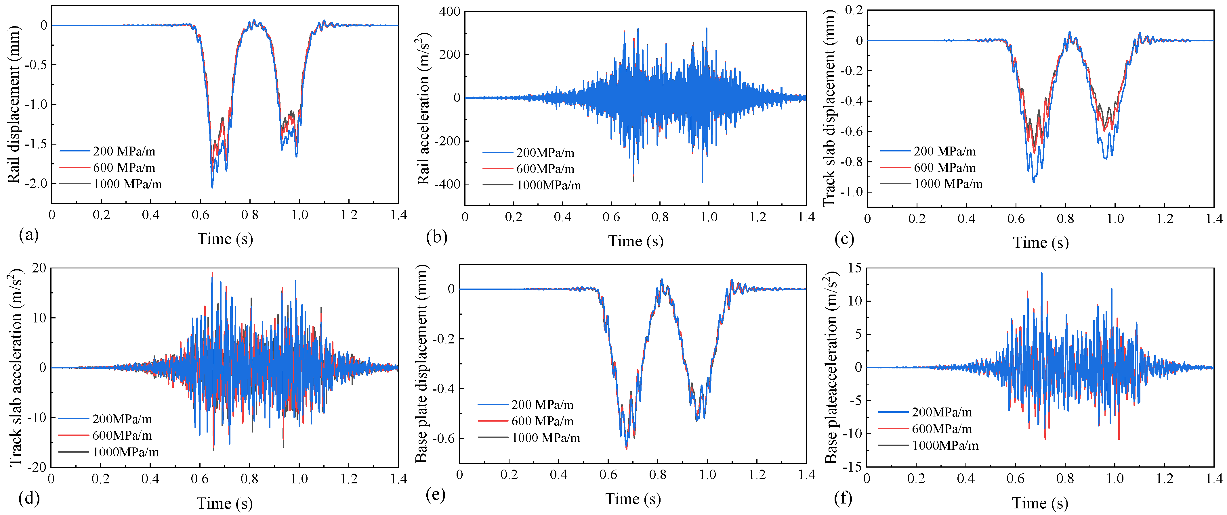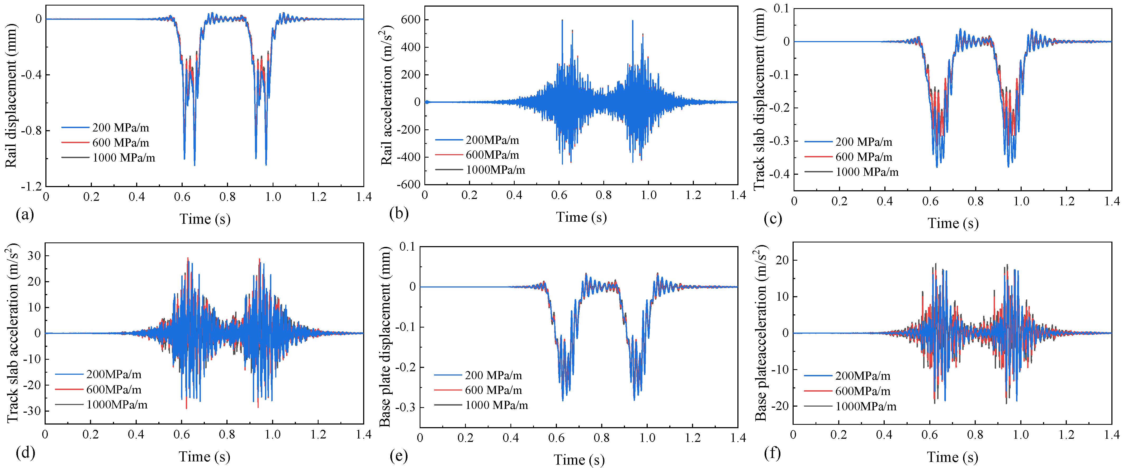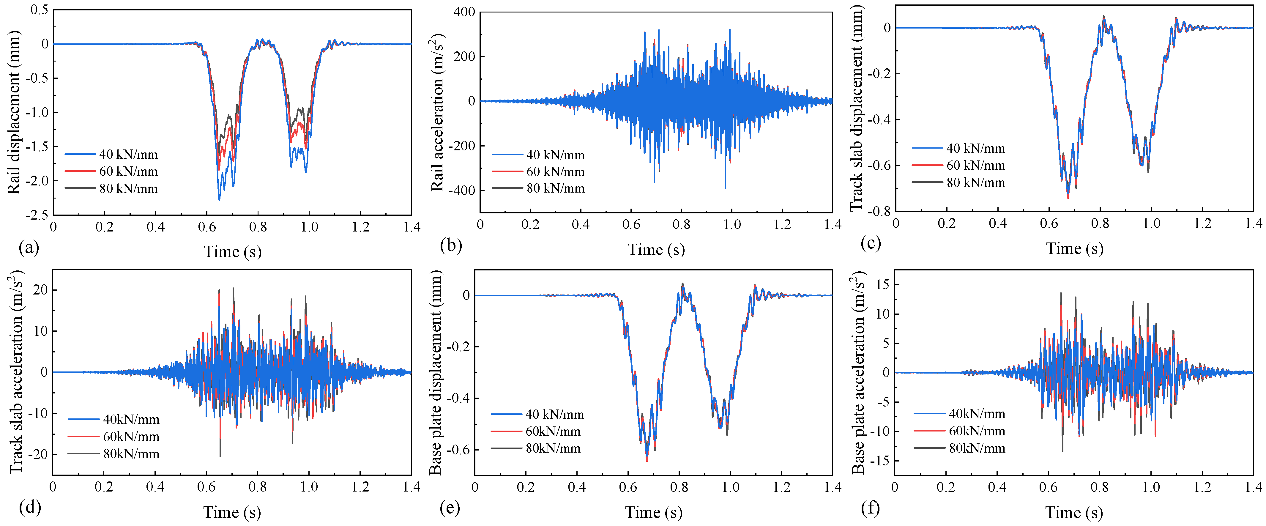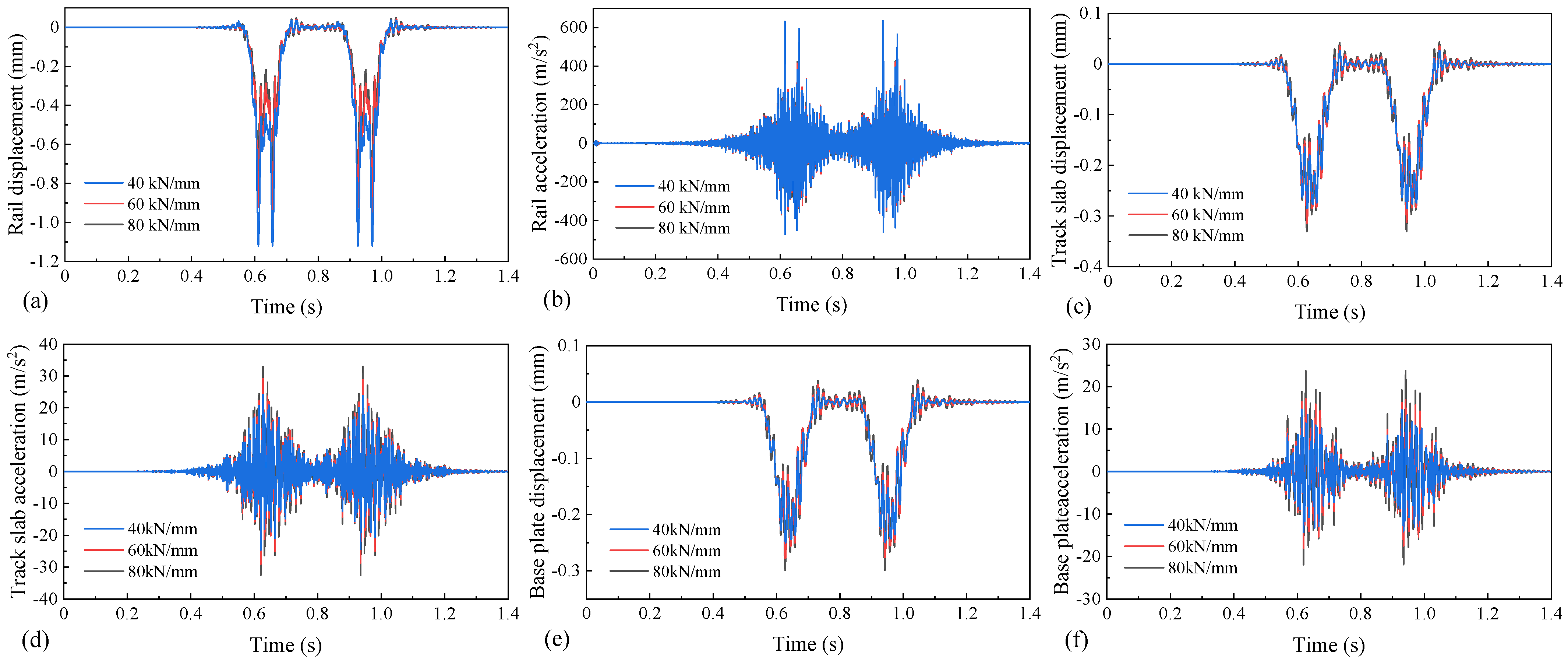 2 (a reduction of 20.92%). Similar to the passenger case, the acceleration of the track slab and base plate increases with stiffness, showing a consistent trend.
