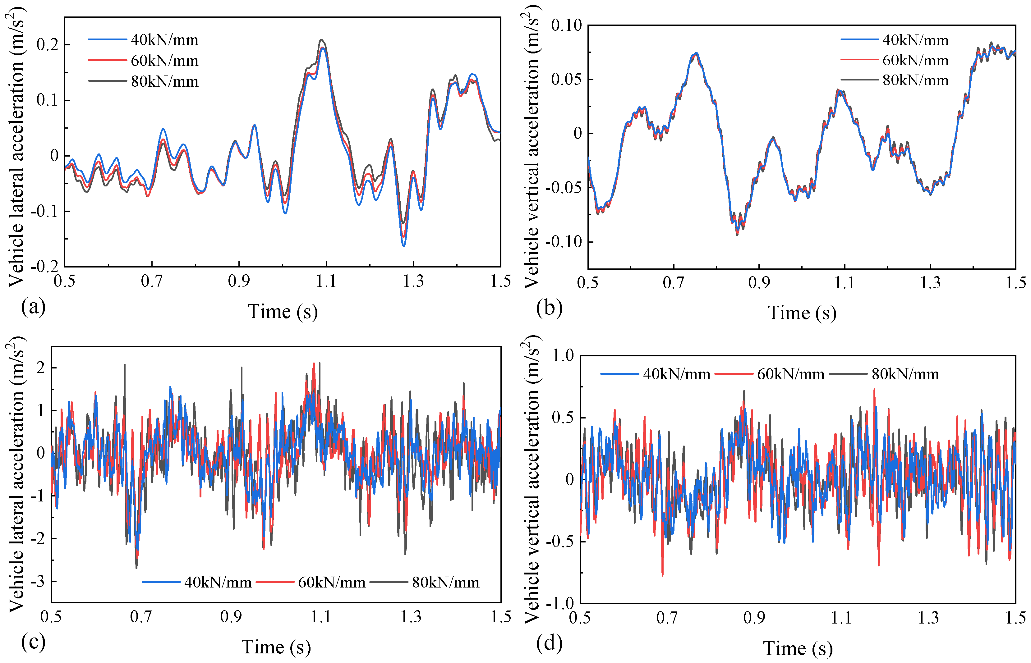 2. This difference results from the more advanced secondary suspension system adopted in passenger trains to ensure ride comfort. The influence of fastener stiffness also varies with vehicle type. Passenger train body vibration is relatively insensitive to stiffness changes because the secondary suspension effectively filters high-frequency excitation transmitted from the track. In contrast, increasing fastener stiffness significantly amplifies the vibration of freight trains. When fastener stiffness increases from 40 kN/mm to 80 kN/mm, the peak lateral acceleration of the freight train increases from 1.56 m/s