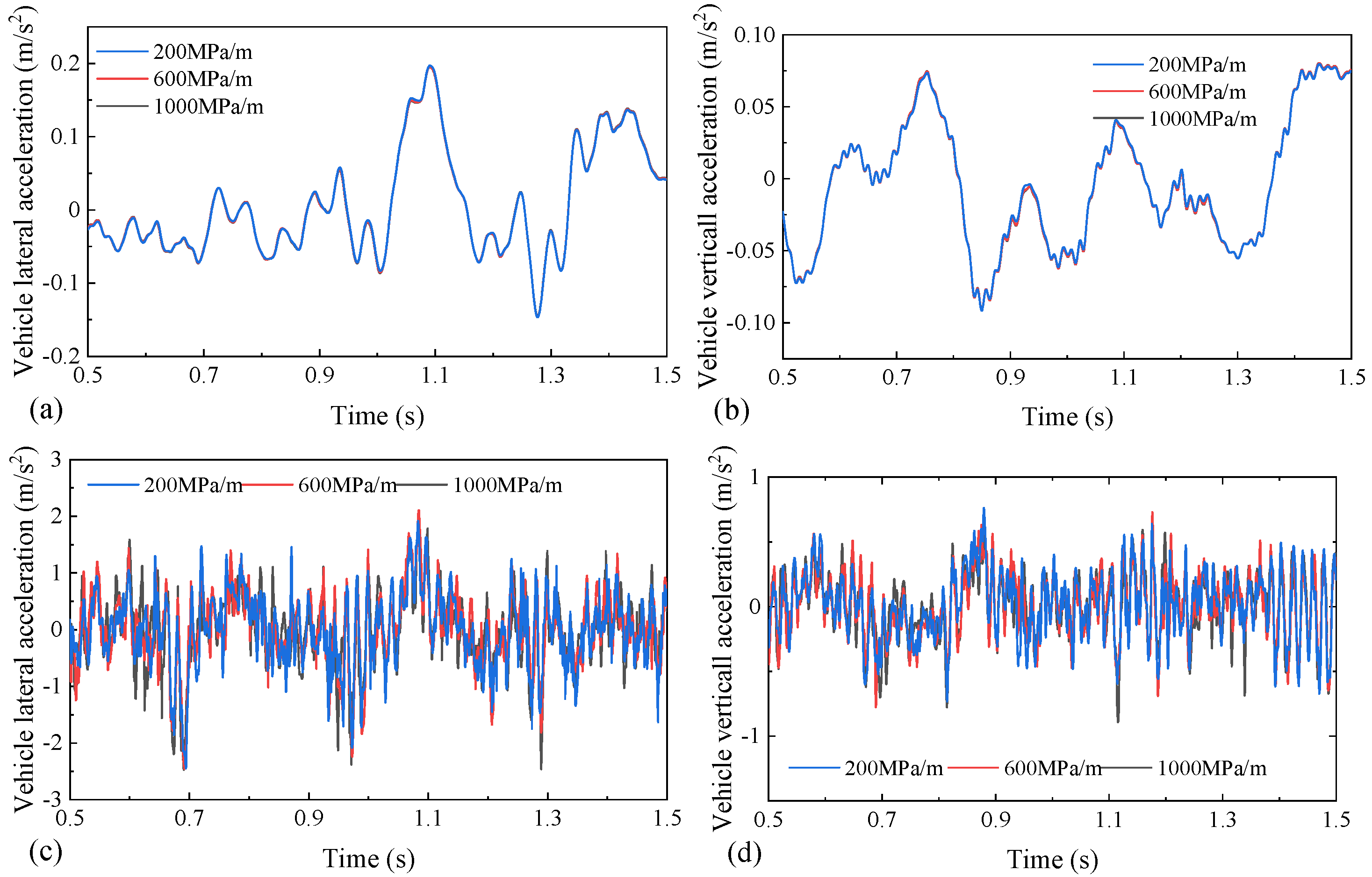 2, substantially higher than those of the passenger train. As the damping pad stiffness increases, the acceleration of the freight train increases noticeably. When the stiffness is 200 MPa/m, the peak lateral acceleration is 2.21 m/s