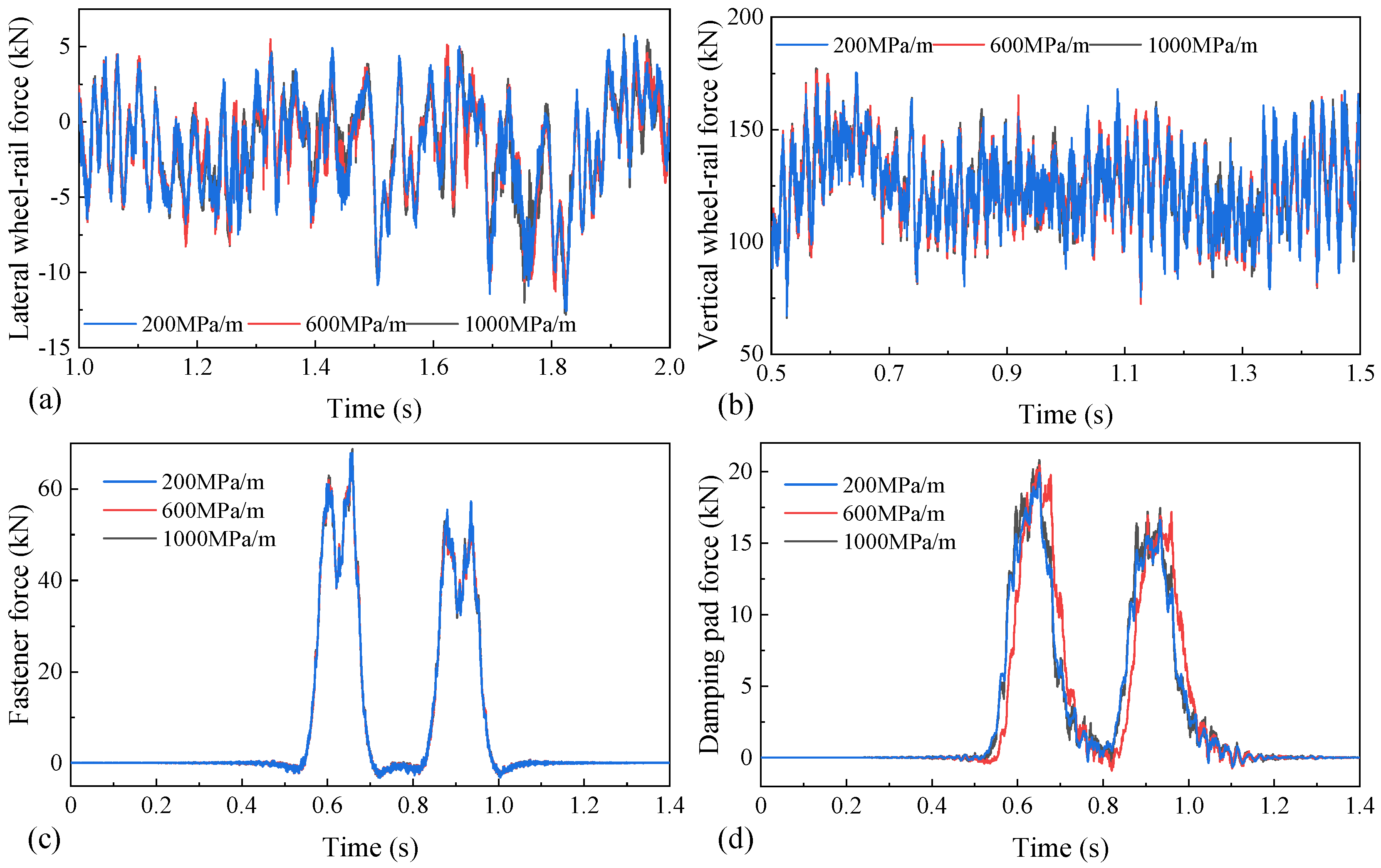Figure 15 presents the interlayer interaction force of the freight railway under different damping pad stiffness levels. Unlike the passenger railway, the wheel–rail force is more sensitive to stiffness variation. The damping pad force first increases and then decreases with stiffness, reaching a maximum at 600 MPa/m. Both the fastener force and damping pad force increase steadily with stiffness. When the stiffness increases from 200 MPa/m to 1000 MPa/m, the maximum fastener force increases from 67.81 kN to 68.75 kN, and the damping pad force increases from 19.92 kN to 20.82 kN. Overall, due to the higher axle load of freight trains, the interlayer force is more sensitive to variations in structural parameters.