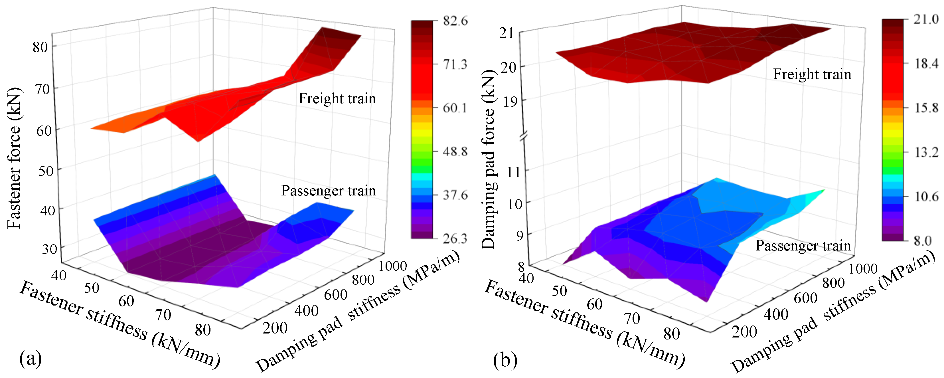 Figure 17 illustrates the maximum interlayer interaction force under different stiffness combinations. Owing to the differences in axle load and running speed between passenger and freight trains, the excitation transmitted to the fastener–pad system differs correspondingly. When the damping pad stiffness is constant, both the fastener force and damping pad force first increase and subsequently decrease with increasing fastener stiffness, indicating a pronounced nonlinear coupling effect between the two layers. When the fastener stiffness is fixed, the damping pad force increases monotonically with growing pad stiffness, with the effect being more pronounced for freight trains. Notably, when the pad stiffness exceeds 600 MPa/m, the fastener force increases sharply, suggesting that excessive pad stiffness may accelerate damage accumulation in the track components.