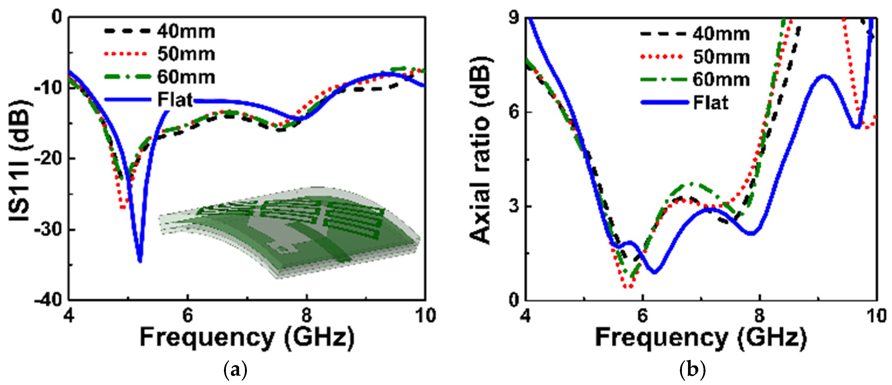 - Shariff, B.G.P.; Ali, T.; Mane, P.R.; Alsath, M.G.N.; Kumar, P.; Pathan, S.; Kishk, A.A.; Khan, T. Design and measurement of a compact millimeter wave highly flexible MIMO antenna loaded with metamaterial reflective surface for wearable applications. IEEE Access 2024, 12, 30066–30084. [Google Scholar] [CrossRef]