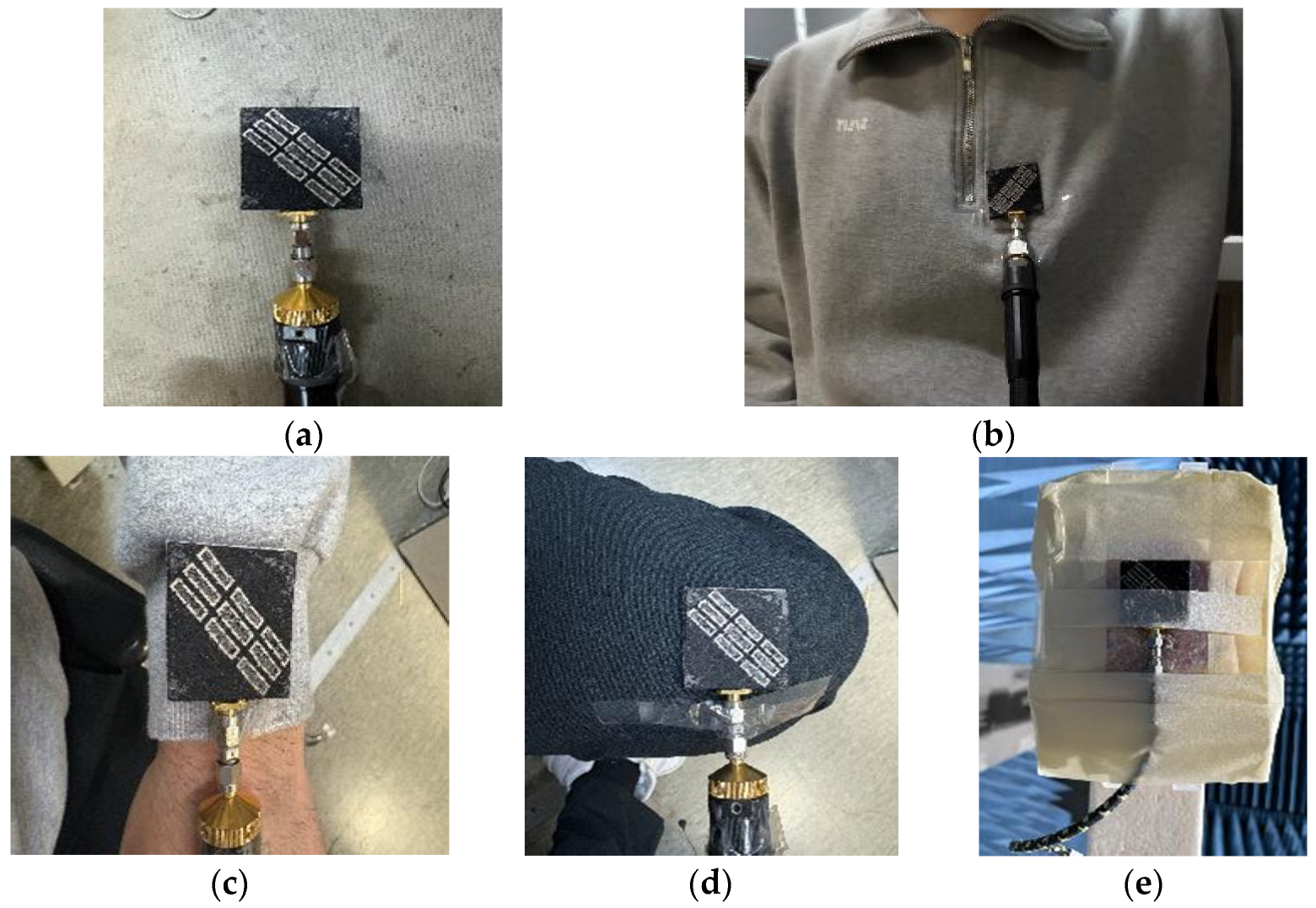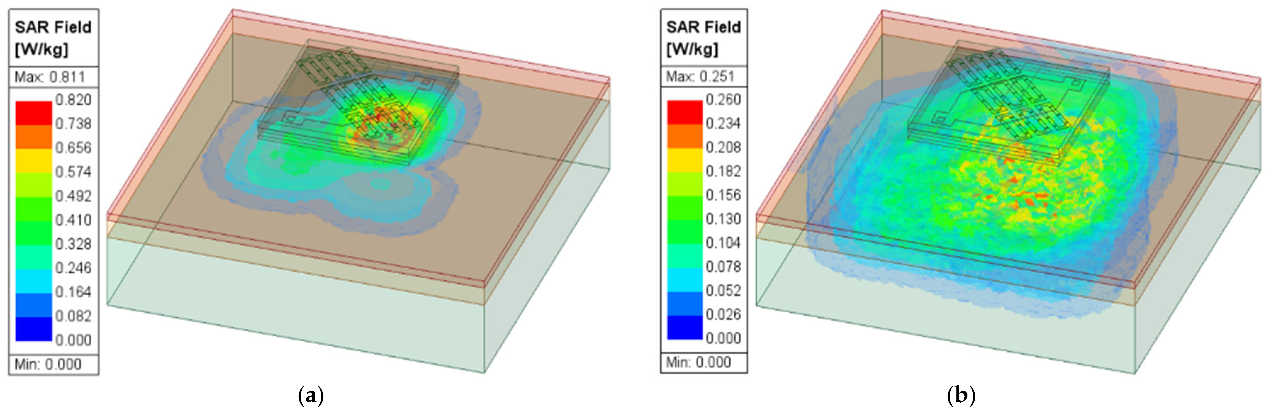 - Qin, Y.; Jiang, D.; Yang, Y.; Wang, C.; Fu, Y.; Ding, F. A high-gain low-SAR wearable antenna based on AMC in wireless body area network. IEEE Antennas Wirel. Propag. Lett. 2025, 24, 1362–1366. [Google Scholar] [CrossRef]