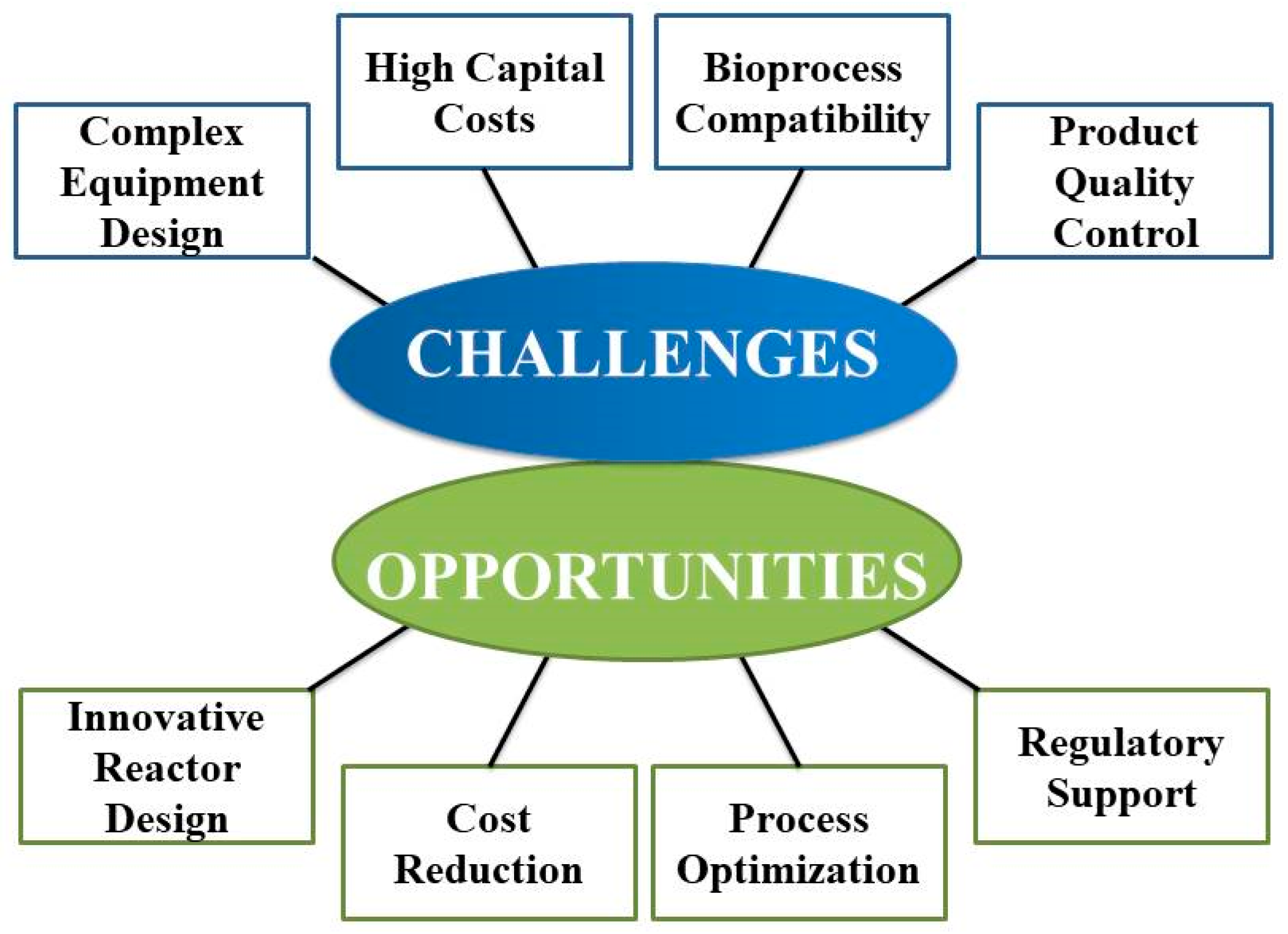 | Shorter Development and Scale-up Time | Accelerated research and development and their commercialization | Digital twins, predictive modeling, modular intensified bioreactors | 30–50% reduction in process development and scale-up timeline | [88,97,100] |