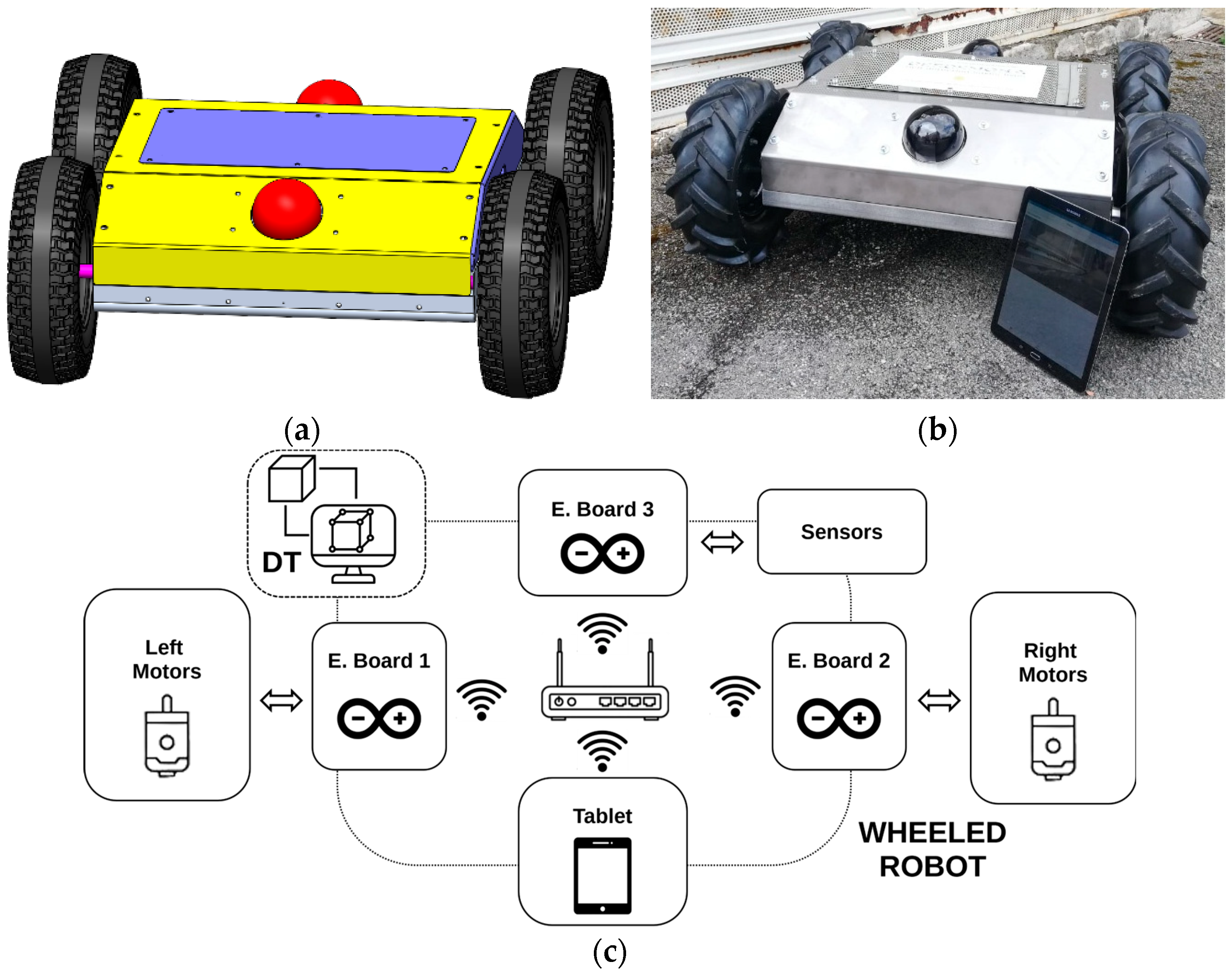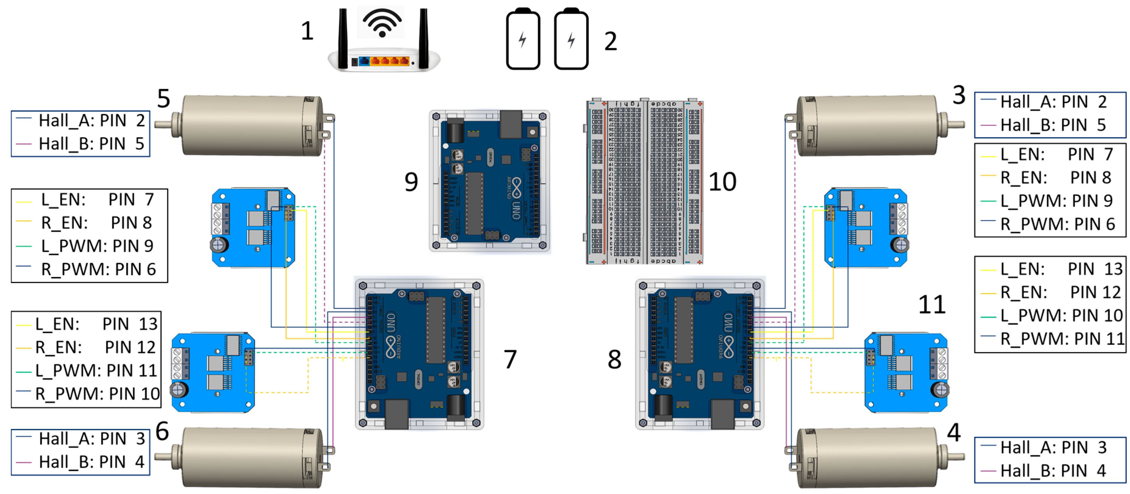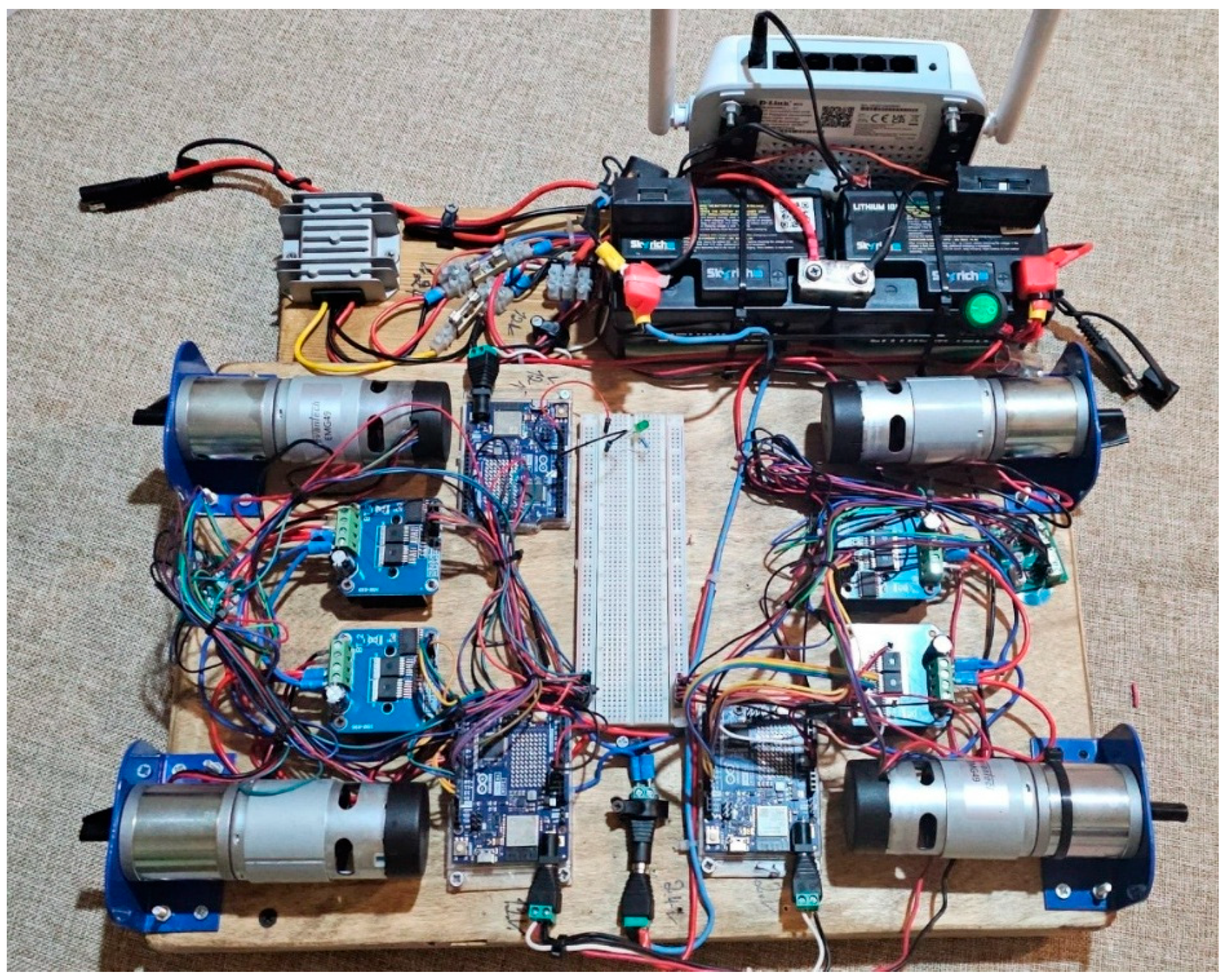 - Connection Breadboard: The breadboard houses the electrical connections between the boards, encoders, and motor drivers, serving as an intermediate platform for the distribution of power and control signals.