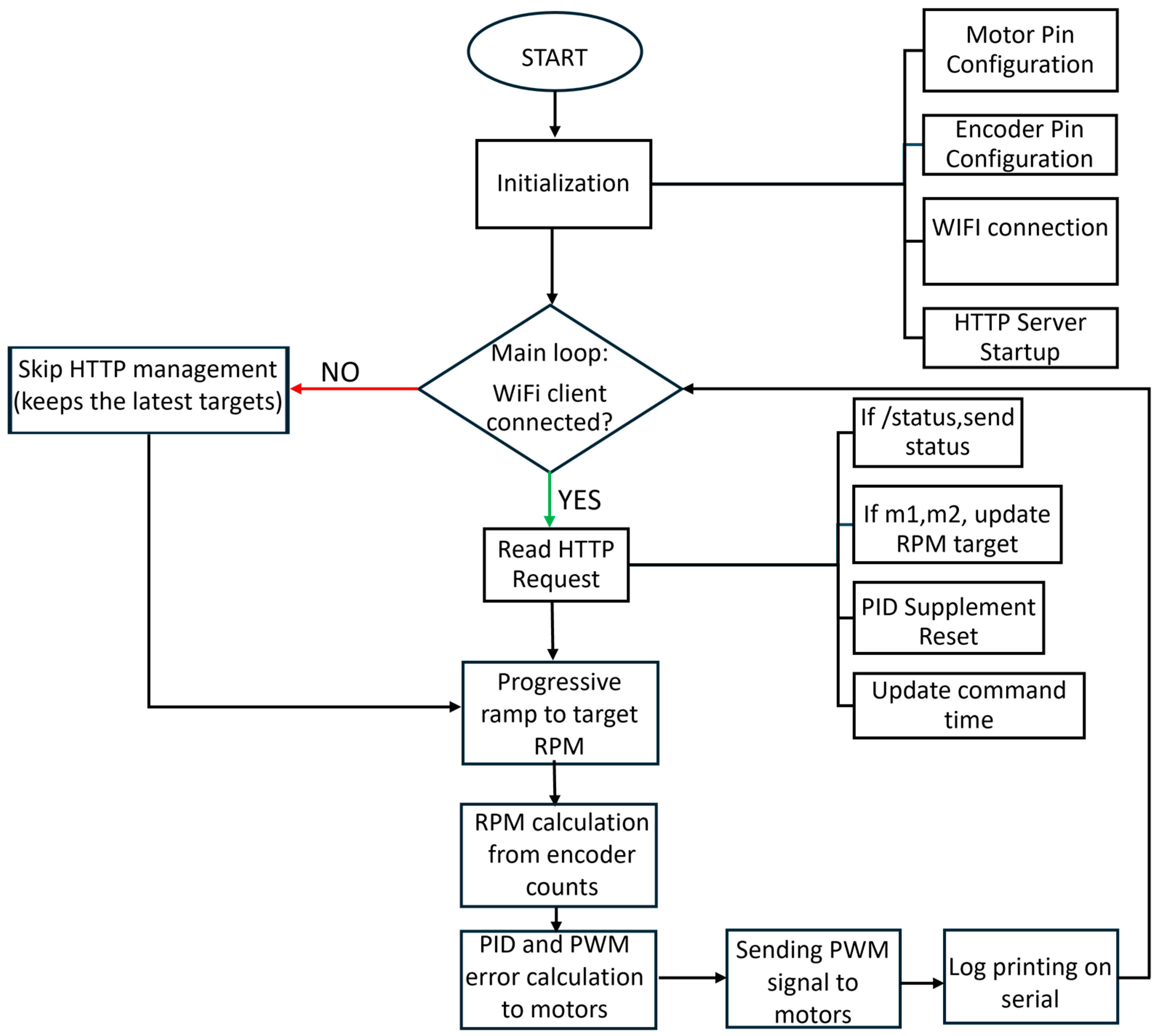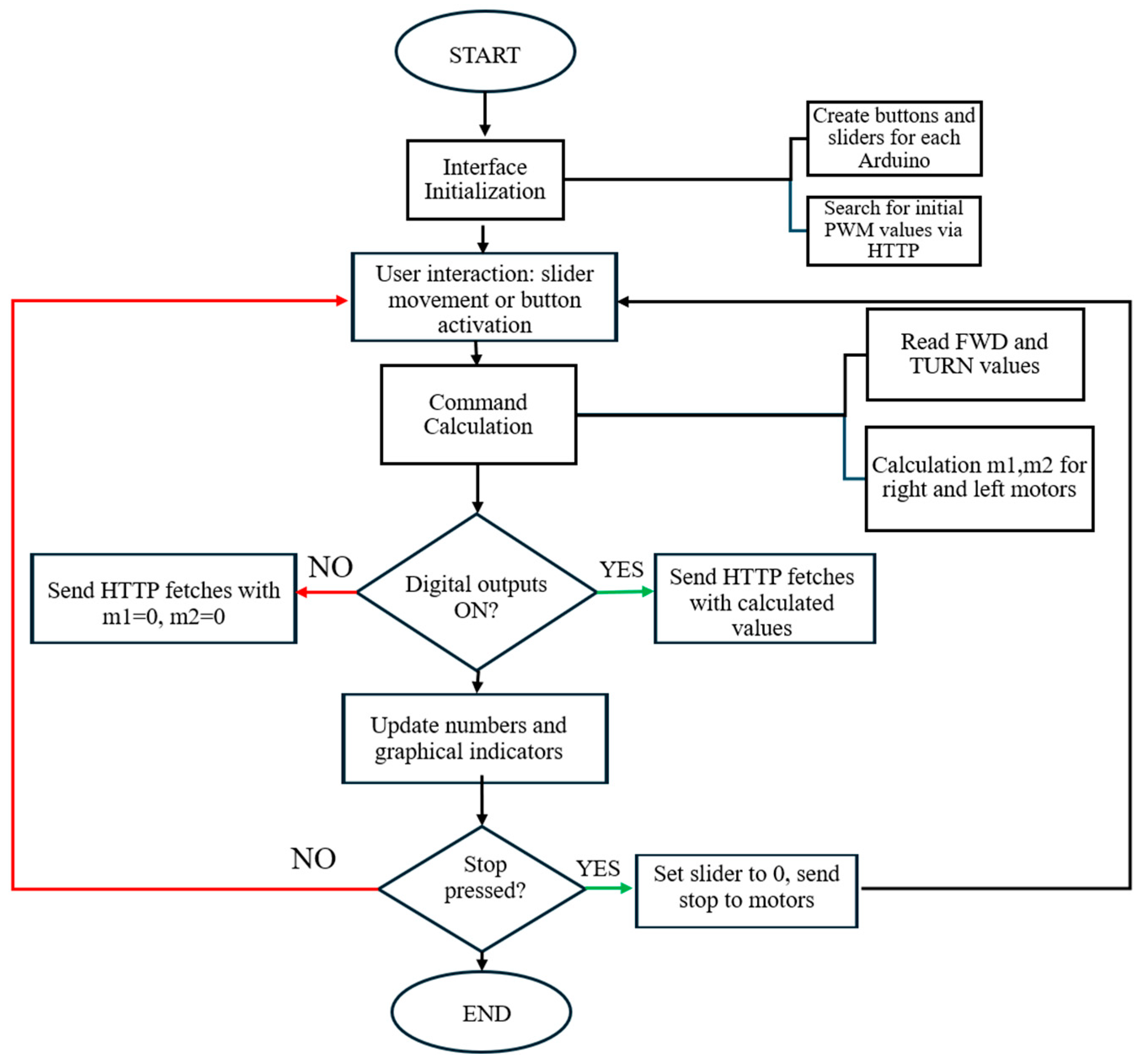 - Arduino “Secondary Left” board: This board is dedicated to controlling the left pair of motors. It receives HTTP commands sent from the graphical interface and calculates the motor control PWM signals in real time, implementing a PID control based on the feedback provided by the encoders. Communication occurs via the WiFiS3 library, which allows for the exposure of a local web server on port 80.