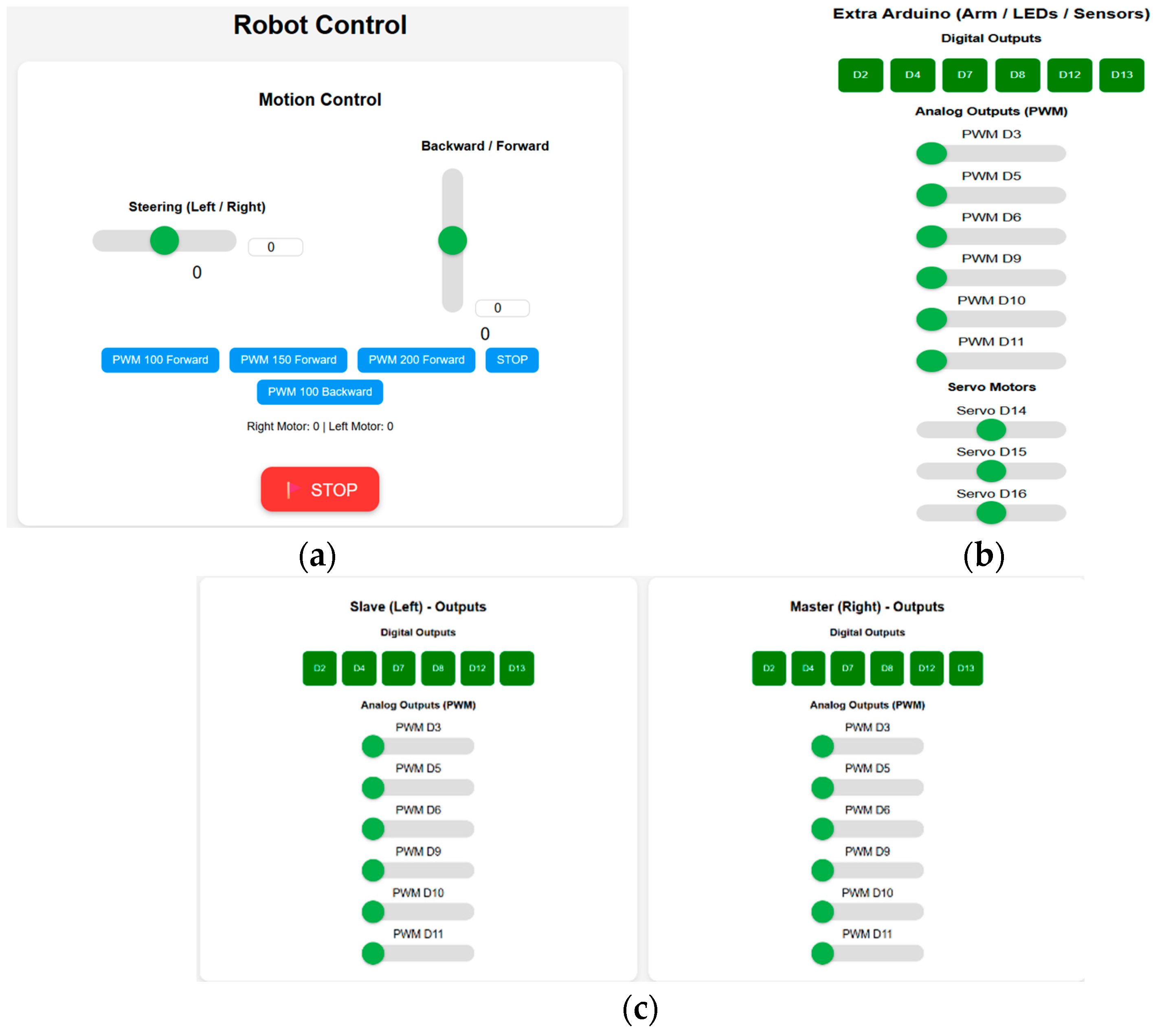 - Arduino “Additional Board”: This third board serves as a system expansion board. It is designed to manage auxiliary devices such as LEDs, sensors, or servomotors. It is also network-accessible and integrated into the graphical interface, allowing for the control of digital outputs, PWM signals, and servos. This modular structure allows for easy system expansion, for example, to control a robotic arm or other future rover modules.