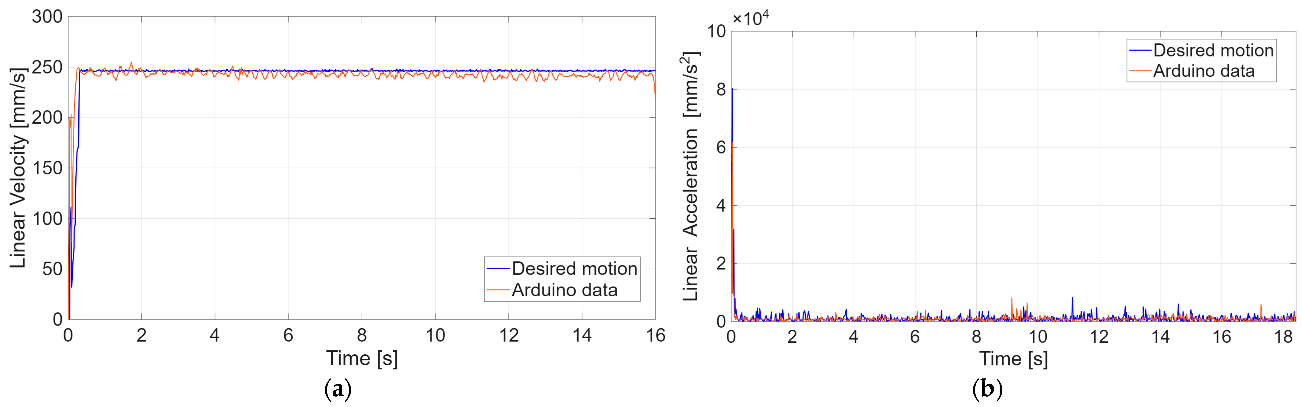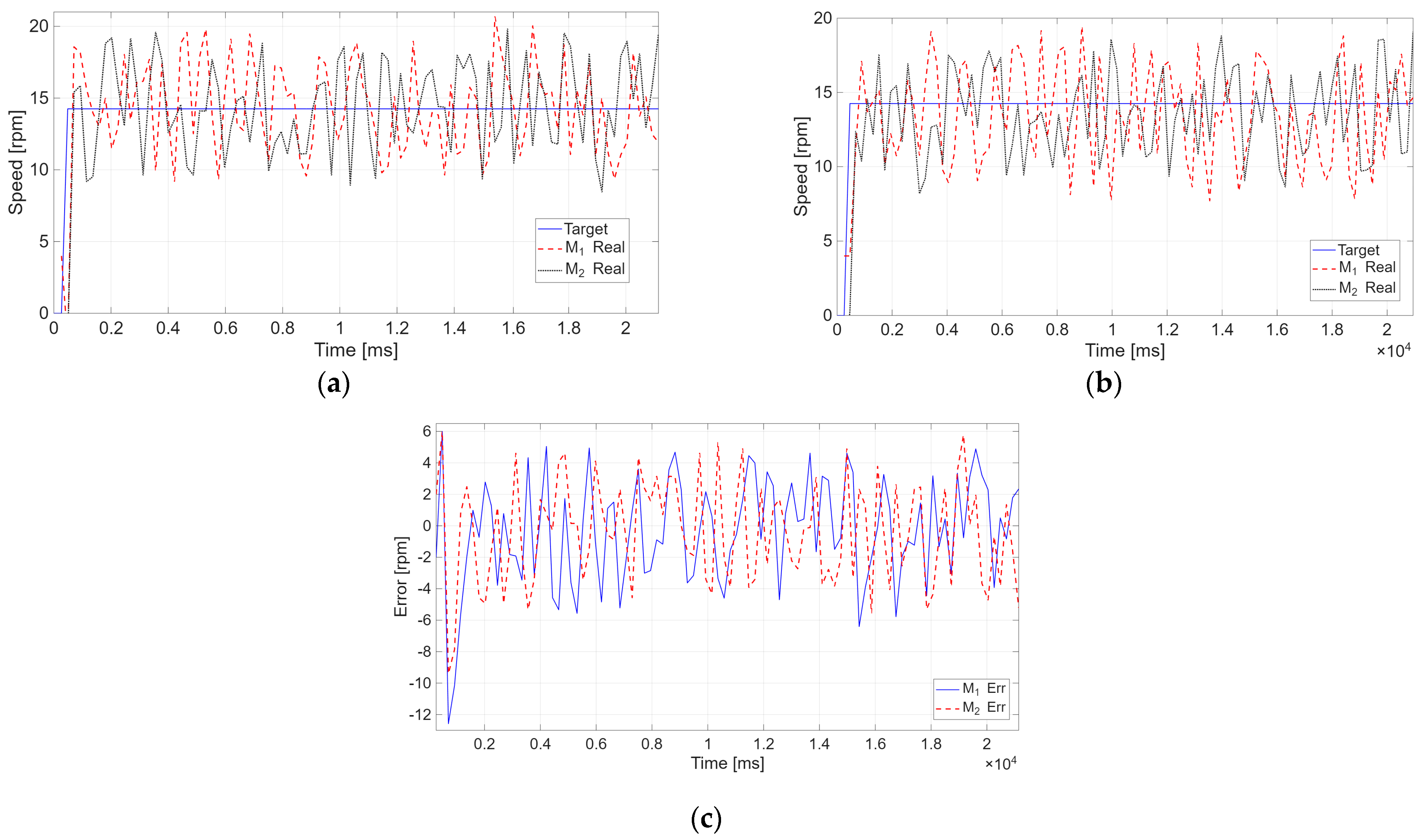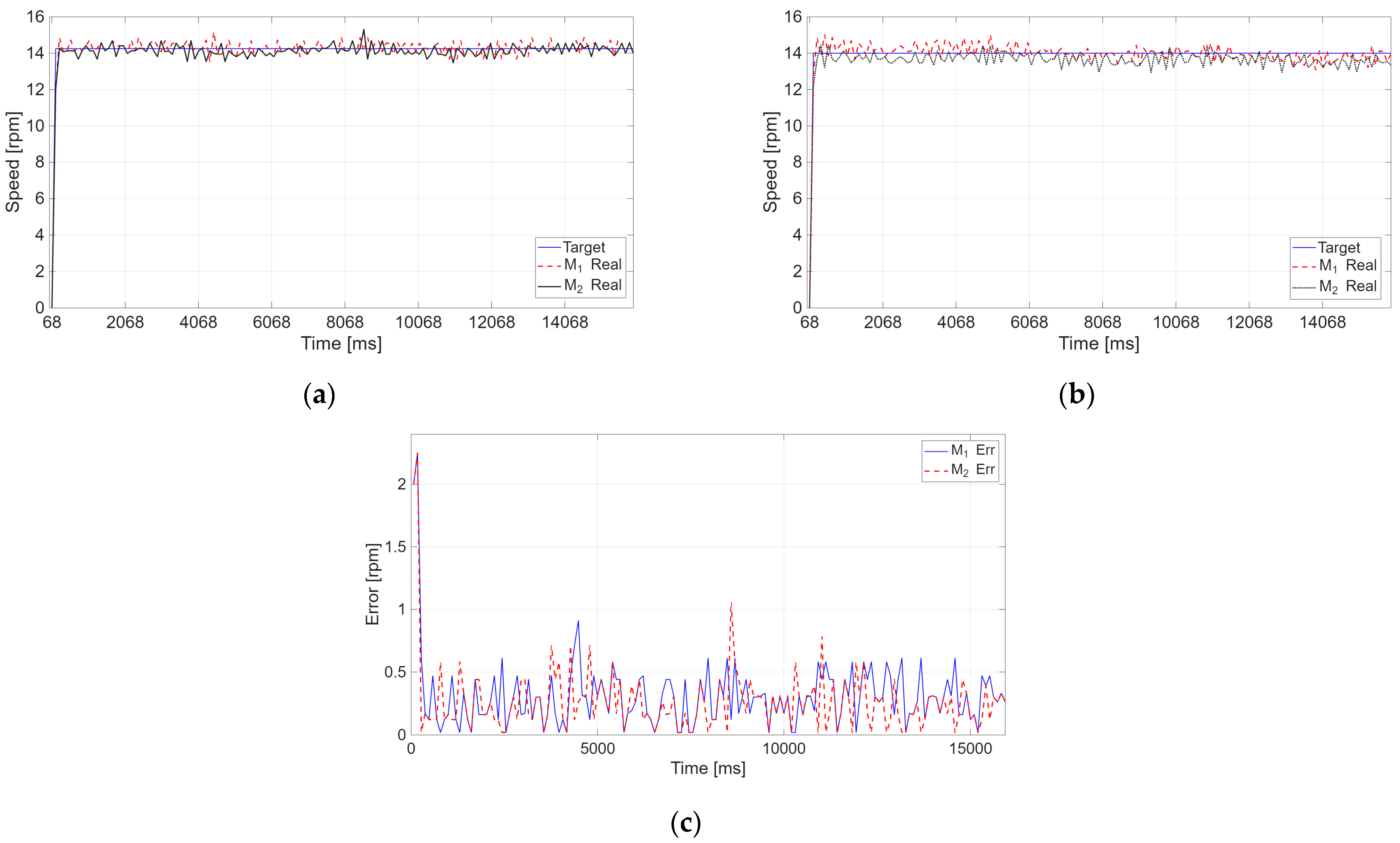 - Optimized PID Case (Figure 8): The responses (Figure 8a,b) show that both motor pairs follow the ideal motion profile almost perfectly, with a rapid settling time and negligible overshoot. The error analysis (Figure 8c) confirms this effectiveness, displaying only reduced initial peaks during the transient phase.