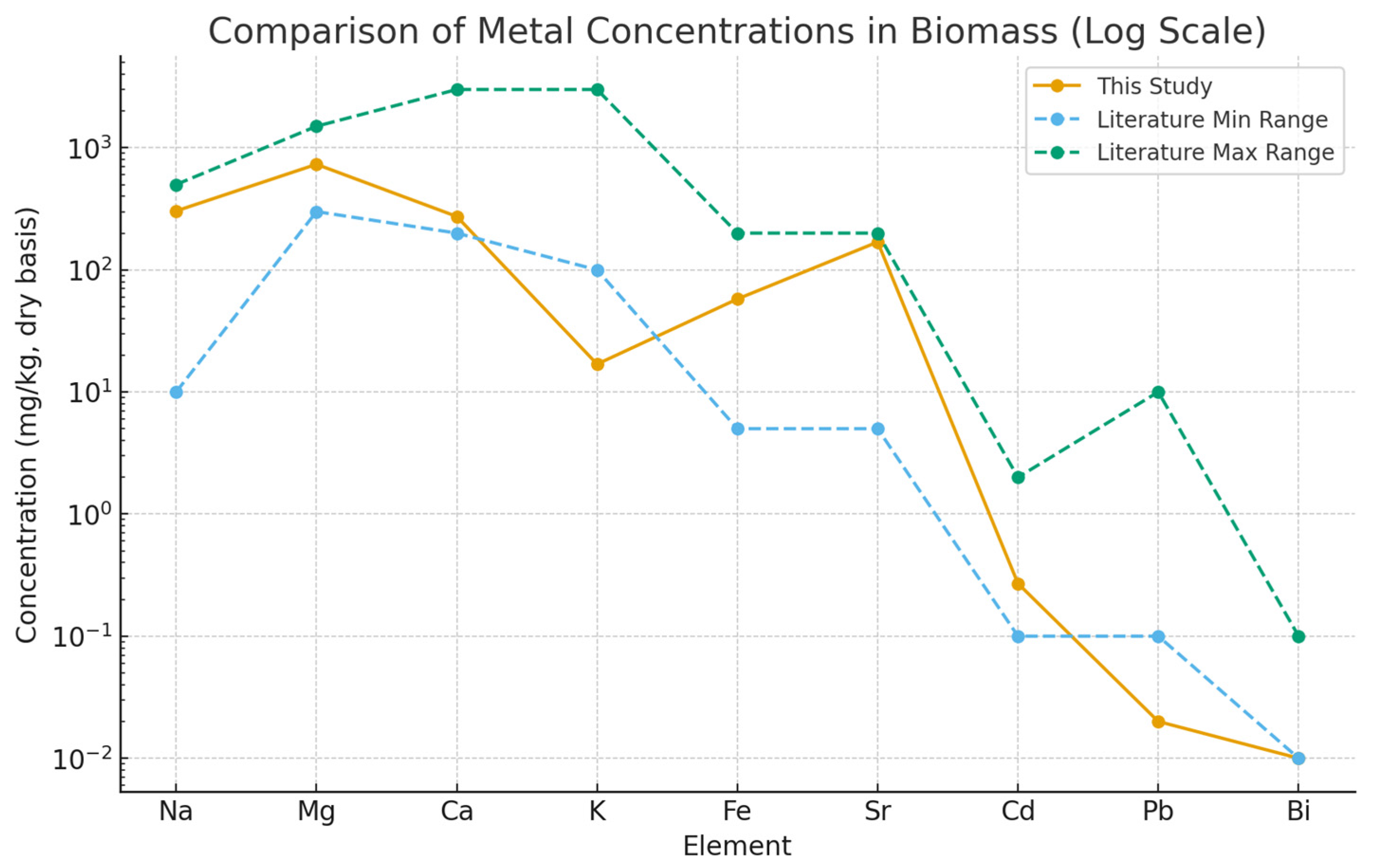 3.4.1. Metals Concentrations in Biomass