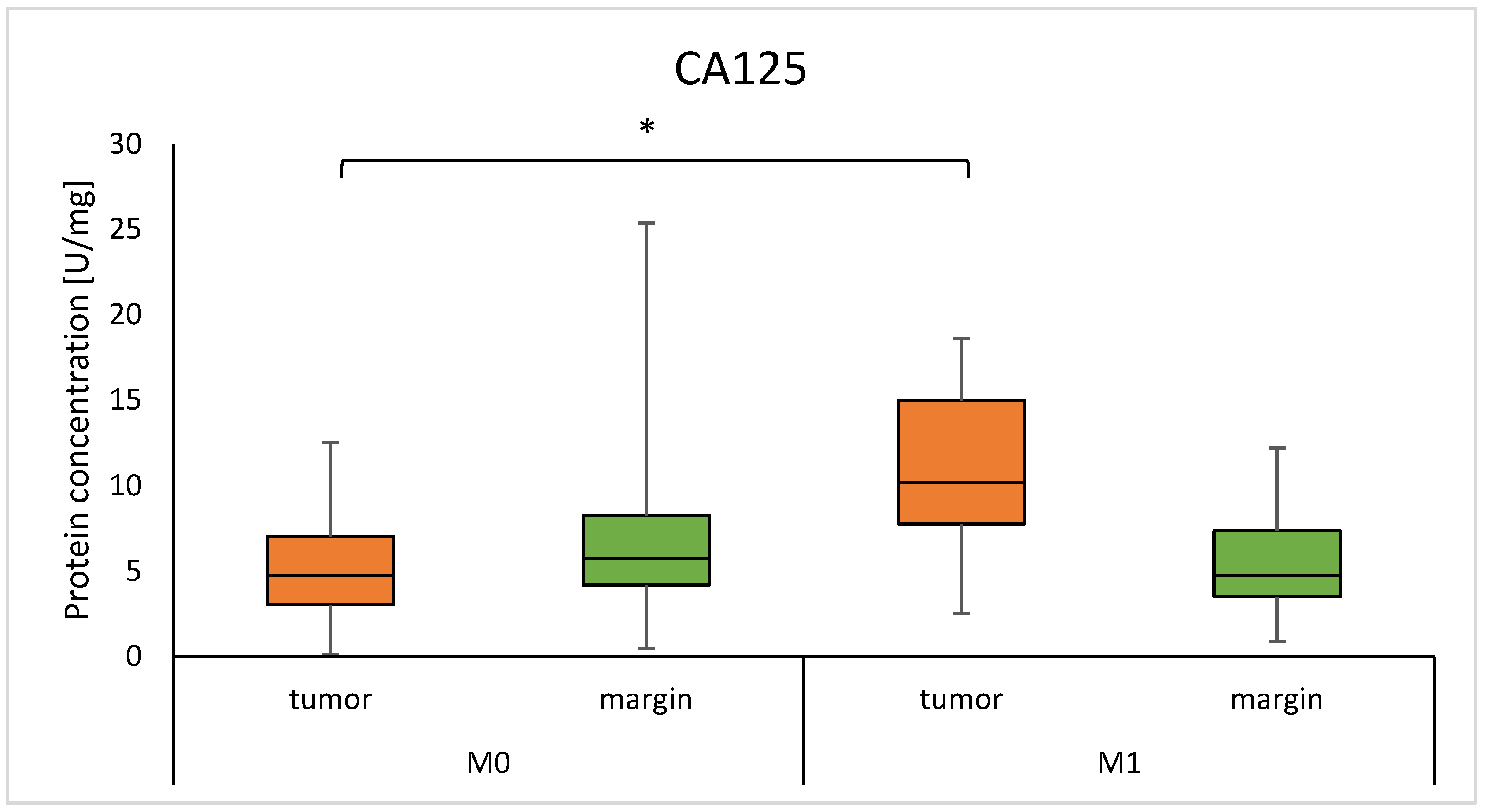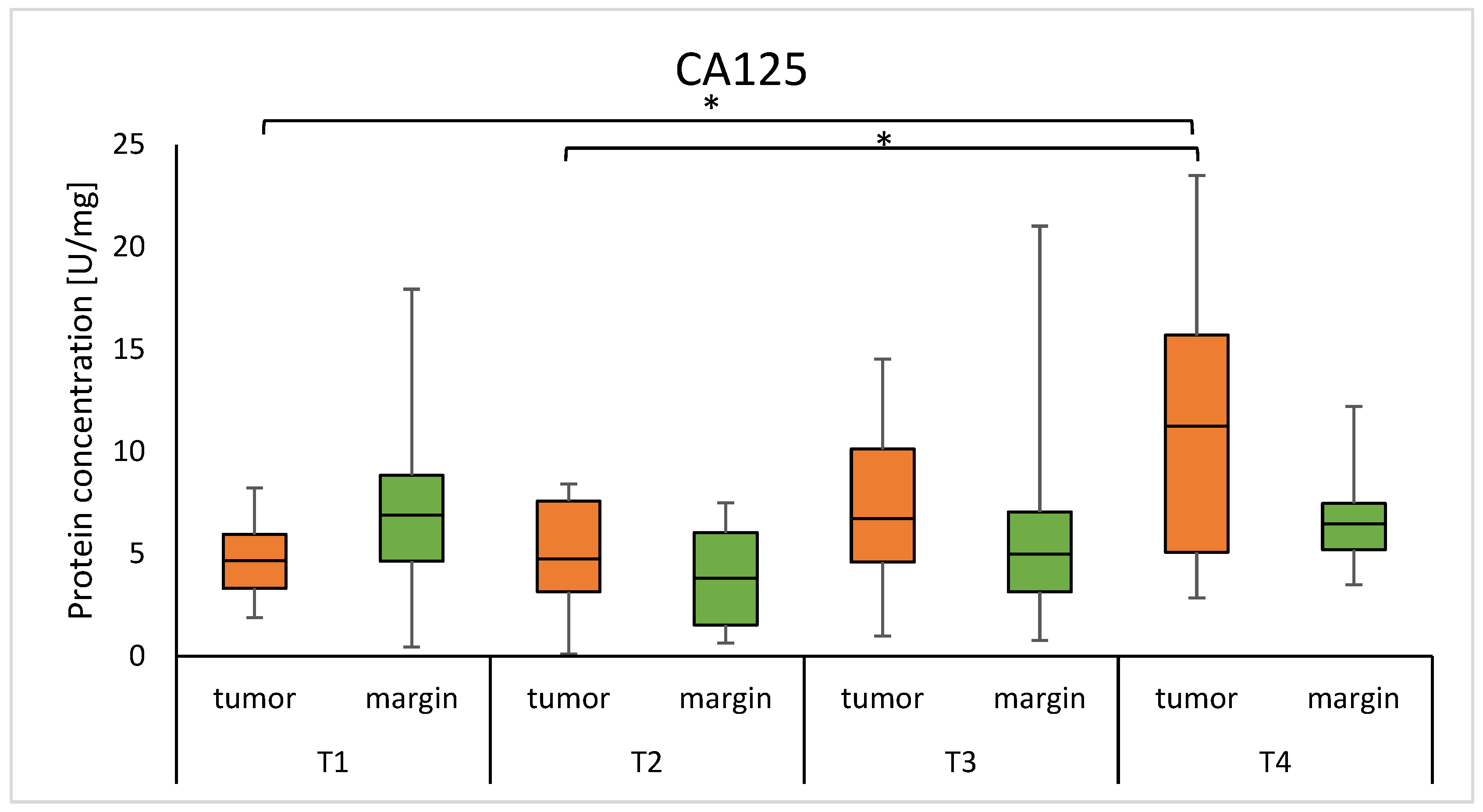 3.2. Protein Level of CEACAM-5, CA125 and HE4 and the Localization of Tumor