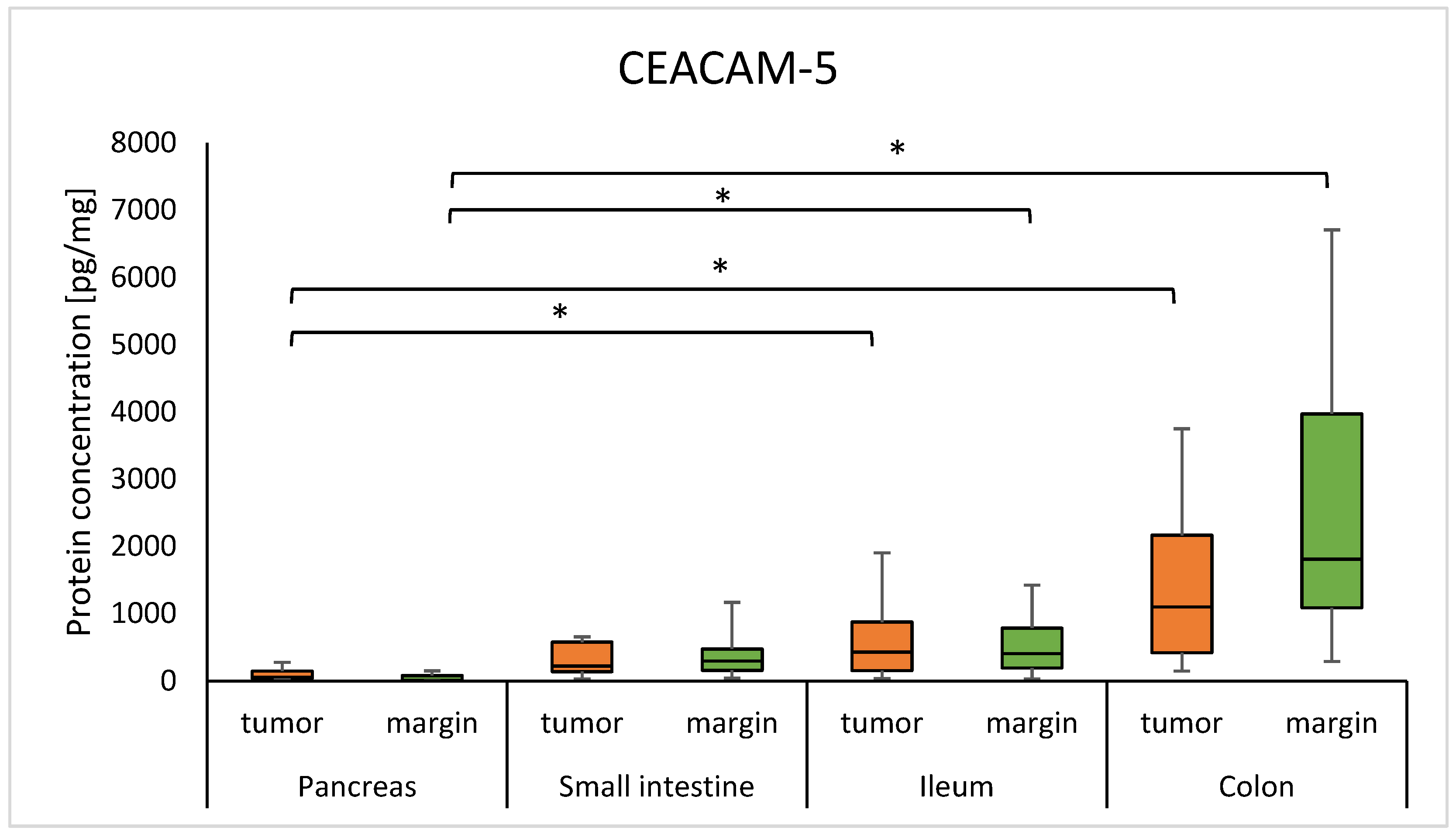 Świętek, A.; Strzelczyk, J.K.; Hudy, D.; Czuba, Z.P.; Snopek-Miśta, K.; Kryj, M.; Kuśnierz, K.; Mrowiec, S.; Zeman, M.; Roś-Mazurczyk, M.; et al. Expression Profile of CEACAM-5, CA125 and HE4 Proteins in Tumor and Corresponding Margin Samples in a Group of Patients with Gastroenteropancreatic Neuroendocrine Tumors (GEP-NET). Appl. Sci. 2026, 16, 692. https://doi.org/10.3390/app16020692