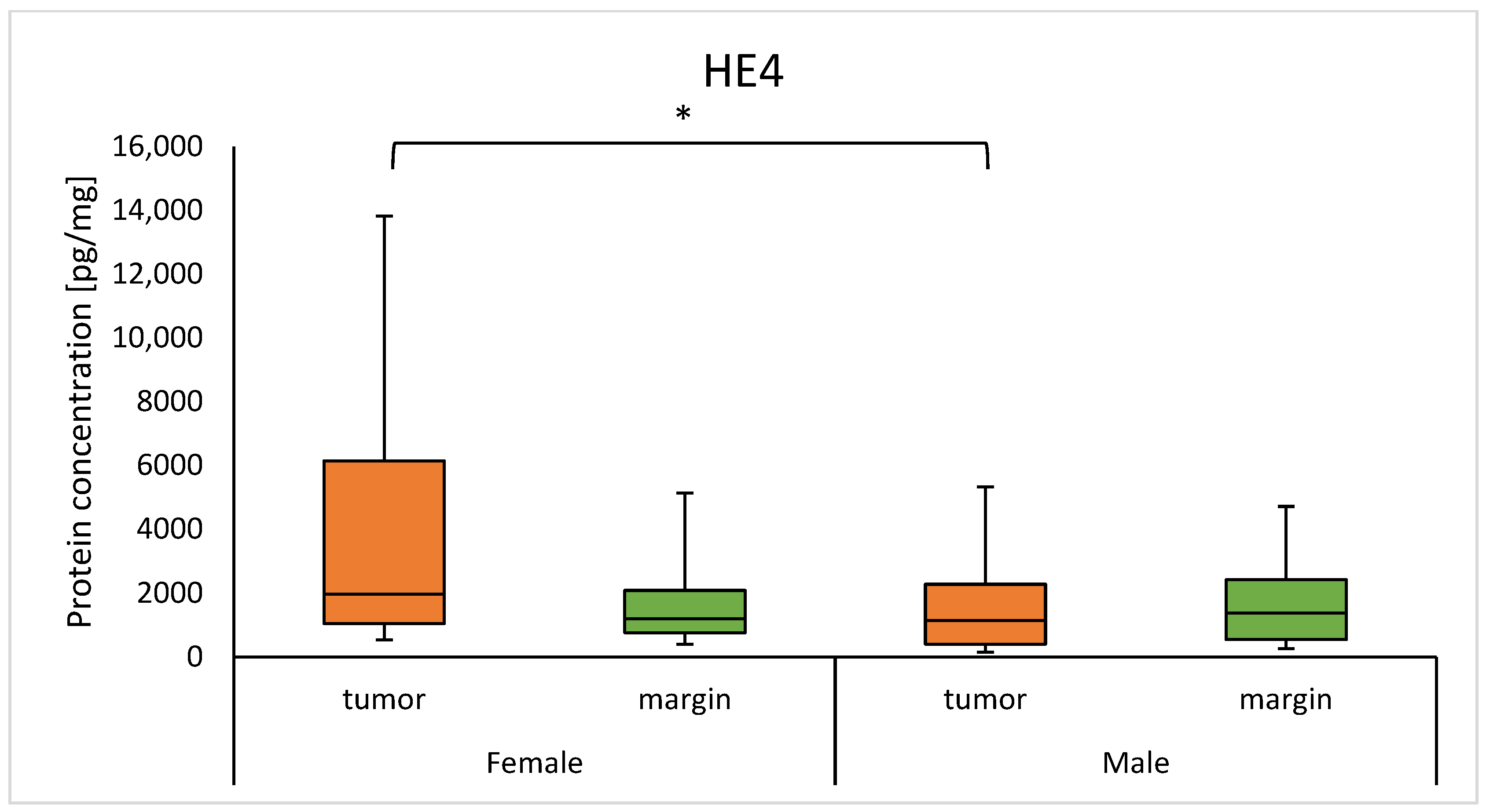 3.3. Protein Level of CEACAM-5, CA125 and HE4 According to Sex