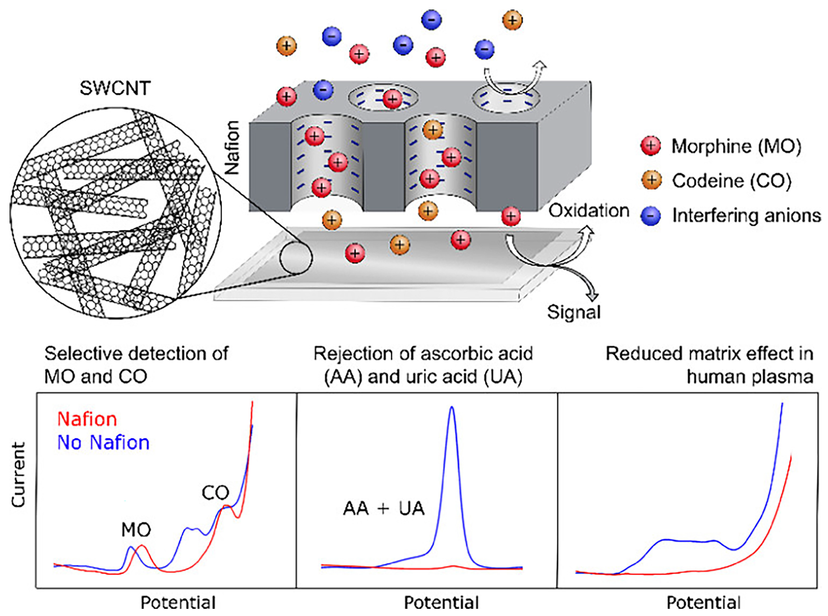 - Wester, N.; Mynttinen, E.; Etula, J.; Lilius, T.; Kalso, E.; Kauppinen, E.I.; Laurila, T.; Koskinen, J. Simultaneous Detection of Morphine and Codeine in the Presence of Ascorbic Acid and Uric Acid and in Human Plasma at Nafion Single-Walled Carbon Nanotube Thin-Film Electrode. ACS Omega 2019, 4, 17726–17734. [Google Scholar] [CrossRef]