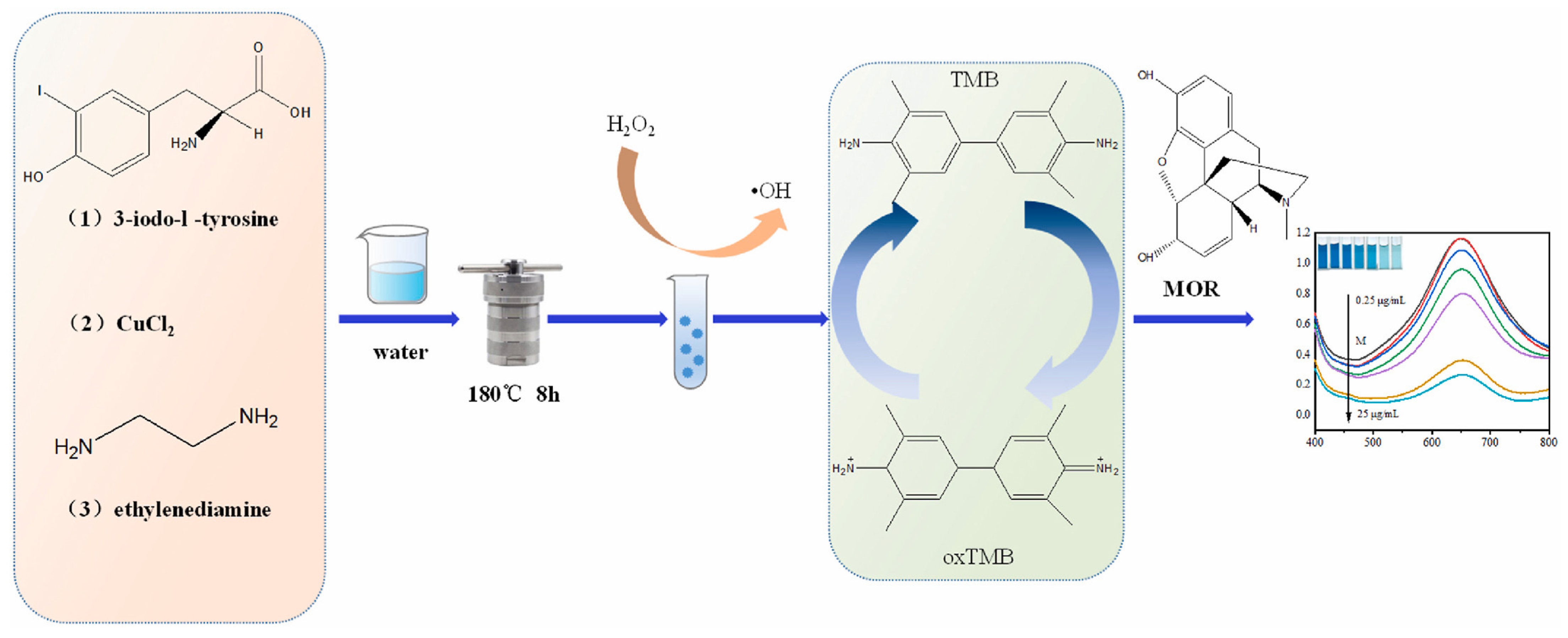 - Yin, Q.; Yang, X.; Yang, L.; Yang, D.; Yang, Y.; Zhu, Y. Cu, I-doped carbon dots as simulated nanozymes for the colorimetric detection of morphine in biological samples. Anal. Biochem. 2023, 680, 115313. [Google Scholar] [CrossRef]