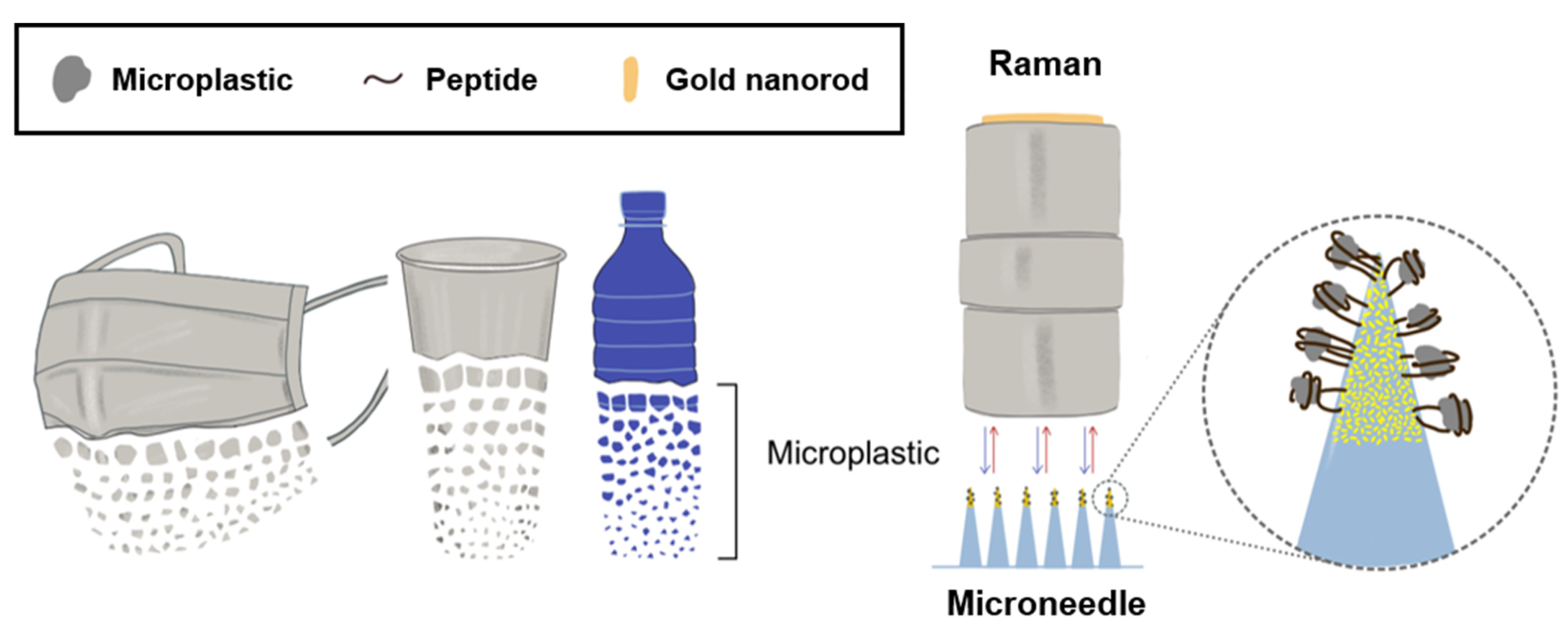 - Ahn, S.; Kim, N.; Choi, Y.; Kim, J.; Hwang, H.; Kim, C.; Lee, H.Y.; Kim, S.; Kim, J.S.; Lee, H.H.; et al. Peptide-Decorated Microneedles for the Detection of Microplastics. Biosensors 2024, 14, 140. [Google Scholar] [CrossRef]