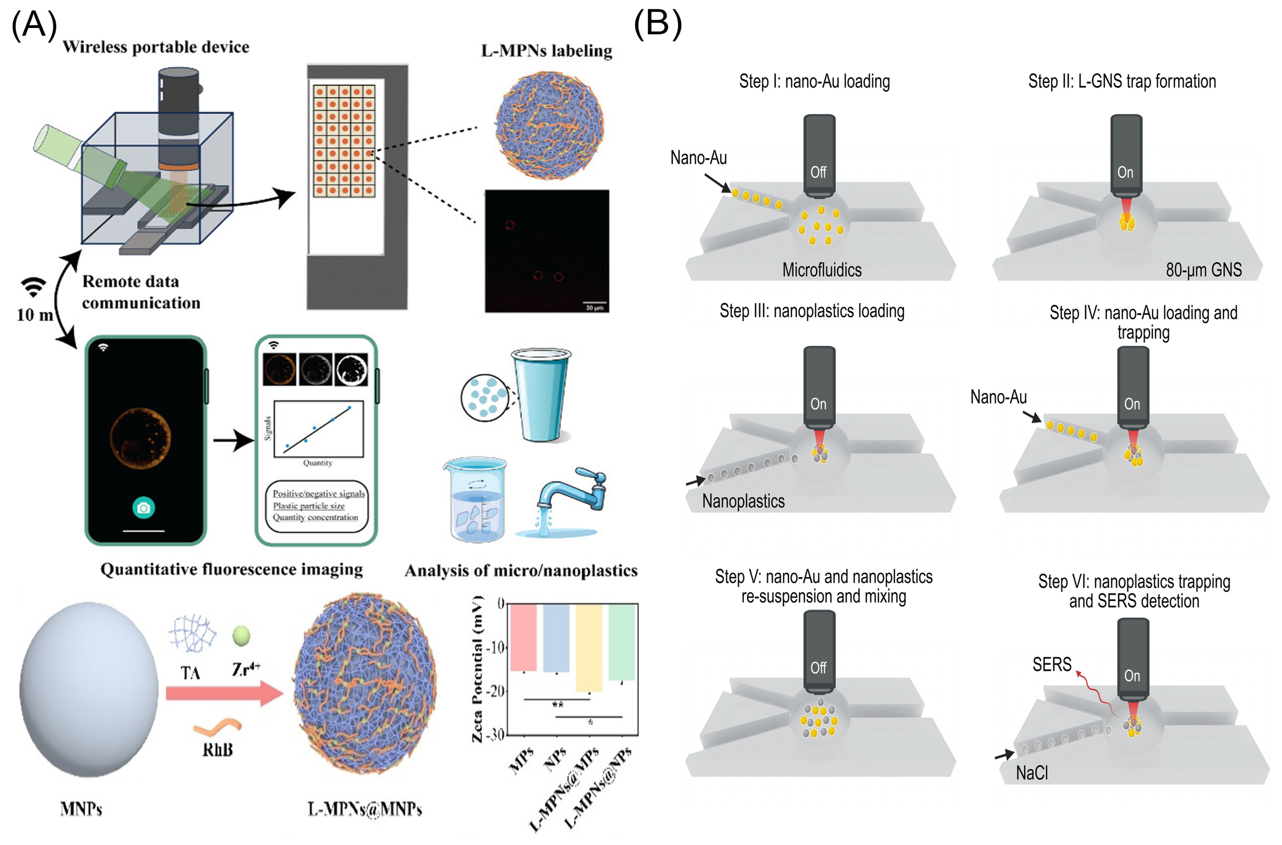 - Shi, X.; Mao, T.; Huang, X.; Shi, H.; Jiang, K.; Lan, R.; Zhao, H.; Ma, J.; Zhao, J.; Xing, B. Capturing, enriching and detecting nanoplastics in water based on optical manipulation, surface-enhanced Raman scattering and microfluidics. Nat. Water 2025, 3, 449–460. [Google Scholar] [CrossRef]