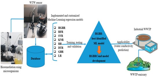 This study proposes HGBRCond, a machine learning model for conductivity prediction in controlled biodegradation processes. Eight regression algorithms were evaluated using experimental data (n = 424) from a micro-pilot treatment system. HGBRCond, based on Histogram-Gradient Boosting Regression (best performing ML model), achieved optimal performance (R2 = 0.877 ± 0.011, RMSE = 10.235 ± 0.54 µS/cm) through 10-fold cross-validation. Unlike standard HGBR and previous conductivity models that lack comprehensive validation frameworks, HGBRCond integrates rigorous statistical validation (cross-validation, sensitivity analysis, confidence intervals) with multi-level interpretability (Morris screening, SHAP analysis, feature importance), achieving a 6.8% performance improvement over standard gradient boosting approaches while addressing mechanistic interpretability gaps present in prior work. However, limitations constrain direct potential industrial applicability: limited dataset (n = 424), narrow conductivity range (285–360 µS/cm), strong dissolved oxygen dependence, sensitivity across two critical parameters, constant flowrate, and validation restricted to controlled conditions. These constraints require model recalibration for potential industrial application. Future work will focus on model validation across extended operational ranges using industrial samples and full-scale testing to establish applicability beyond controlled experimental settings.