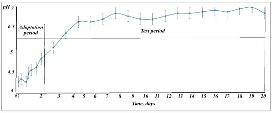 The pH parameter was monitored in the supernatant from the decanter in order to monitor the viability of microorganisms in the biocenosis. The acclimation period (2.4 days) to laboratory conditions in which a mineral medium feed was carried out was the time required to reach a reasonable stability of the system, reflected by the pH. The pH value (Figure 3) was located during the acclimation period between 4.2 and 5.5 after which it reached almost 6, continuing throughout the experiment at a stable pH range, in the neutral range of 6.2–7.