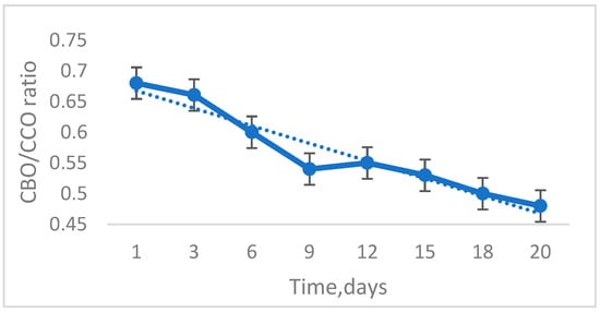 The analysis of experimental values obtained from measuring BOD/COD ratio in the analyzed samples is presented in Figure 4 that shows that in the first part of the test, during the adaptation period of the biological sludge, the ratio was slightly increased in the range of 0.69–0.65. During the purification process of the chemical medium introduced into the system, the BOD/COD ratio was decreasing, during the period 3–9 days it had values between 0.65 and 0.55. During the period of 9–12 days, the ratio was maintained with a trend of stability at a value close to 0.55 with a slight increase to 0.57 on day 12, and in the following period it was to decrease slightly, reaching the value of 0.47 at the end of the experiment [39]. The average of the values obtained is 0.593 and the standard deviation is 0.073. The minimum value is 0.480 and the maximum value is 0.68. The coefficient of variation (RDS) is 12.24%