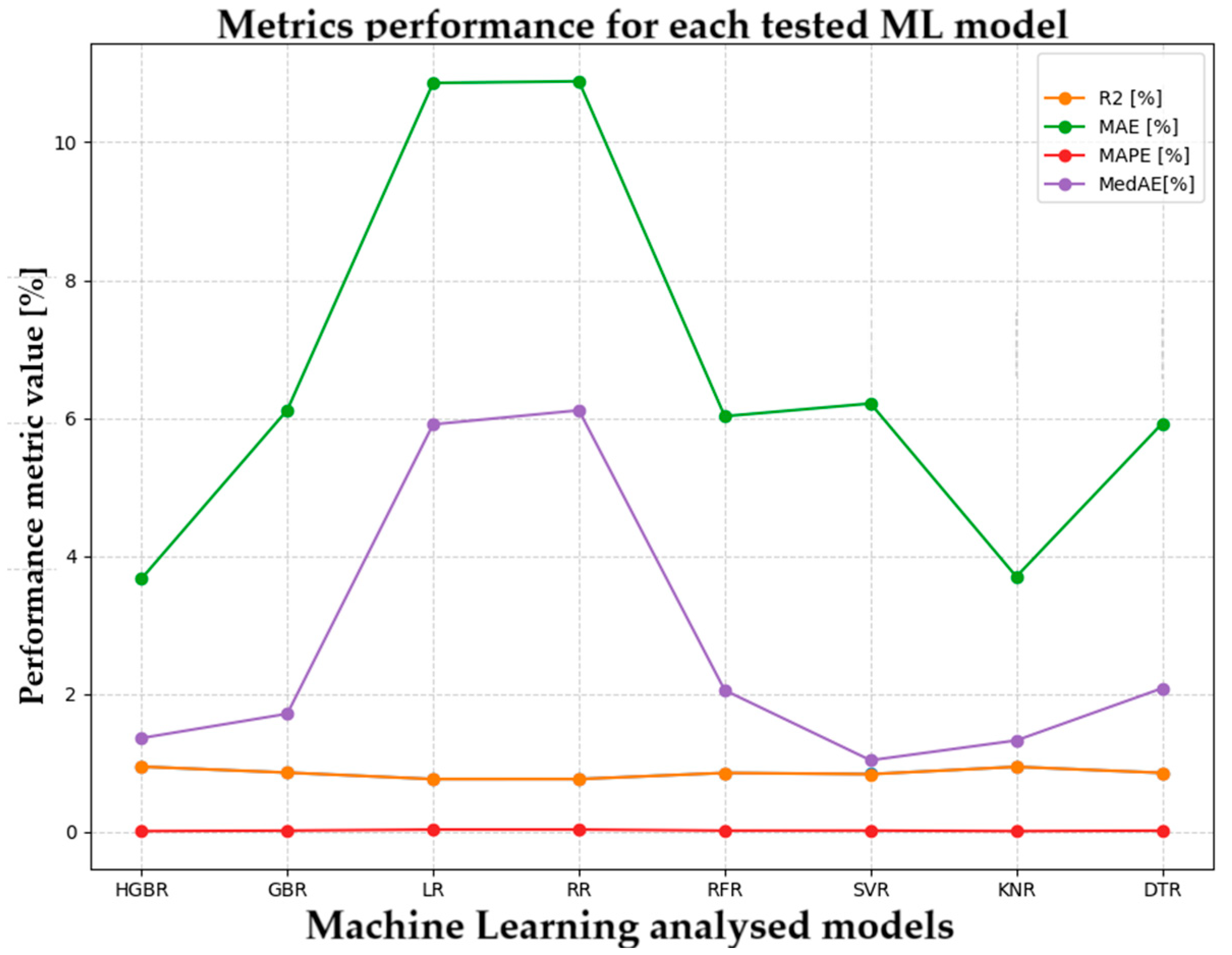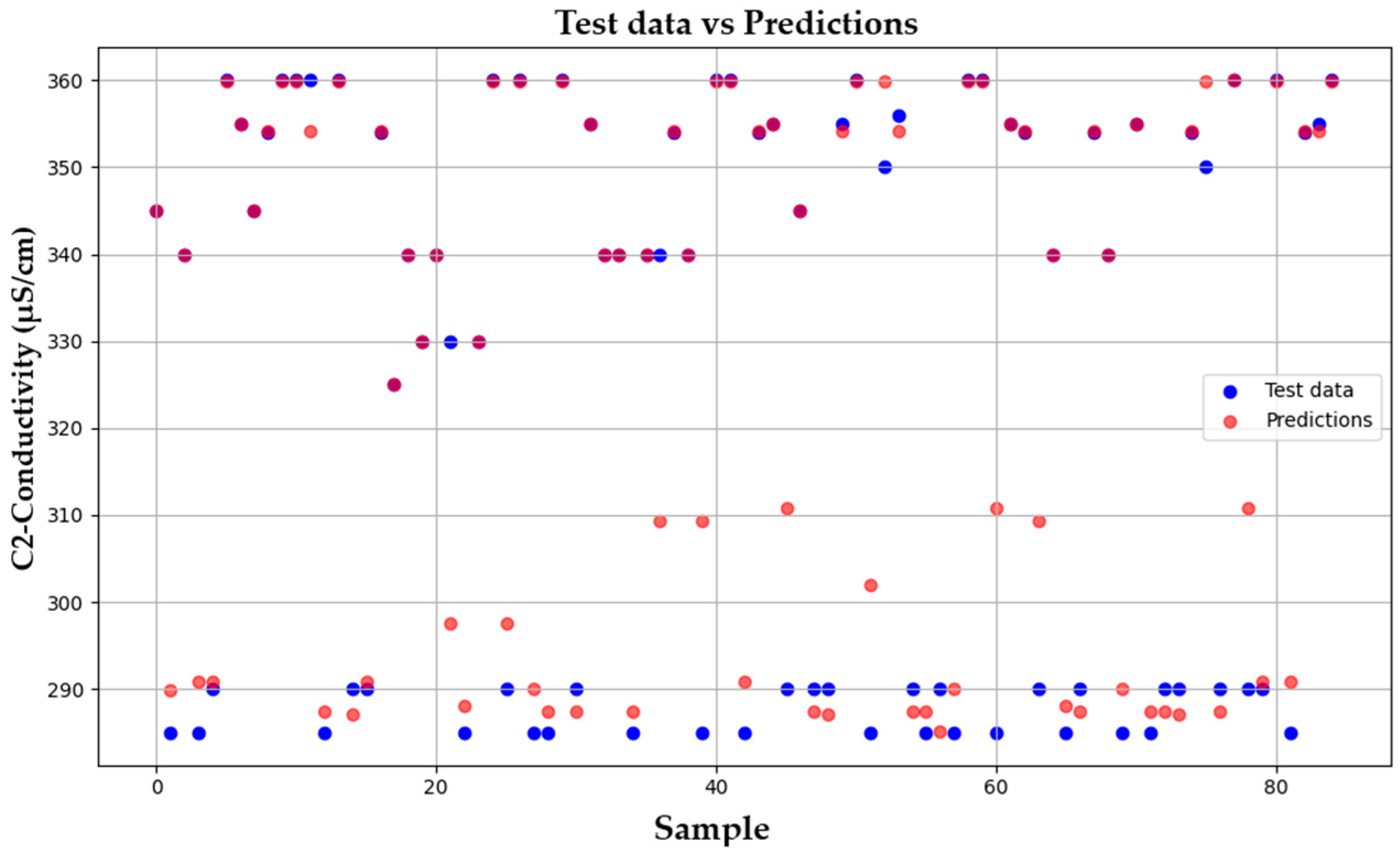 | Sensitivity analysis | Hyperparameters variations | ΔR2, ΔRMSE, ΔMAE, CV (%) | Moderate sensitivity: min_samples_leaf: CV = 2.65%, ΔR2 = 0.024 µS/cm; (Table 10) Moderate sensitivity: max_depth: CV = 2.36%; ΔRMSE = 0.243 µS/cm; (Table 11) Moderate sensitivity: max_bins: CV = 4.53%; ΔRMSE = 0.479 µS/cm; (Table 11) High sensitivity: min_samples_leaf: CV = 9.09%; ΔRMSE = 0.88 µS/cm; (Table 11) High sensitivity: min_samples_leaf: CV = 20.67% ΔMAE = 0.971 µS/cm; (Table 12) High sensitivity: max_bins: CV = 20.51%; ΔMAE = 1.026 µS/cm; (Table 12) |