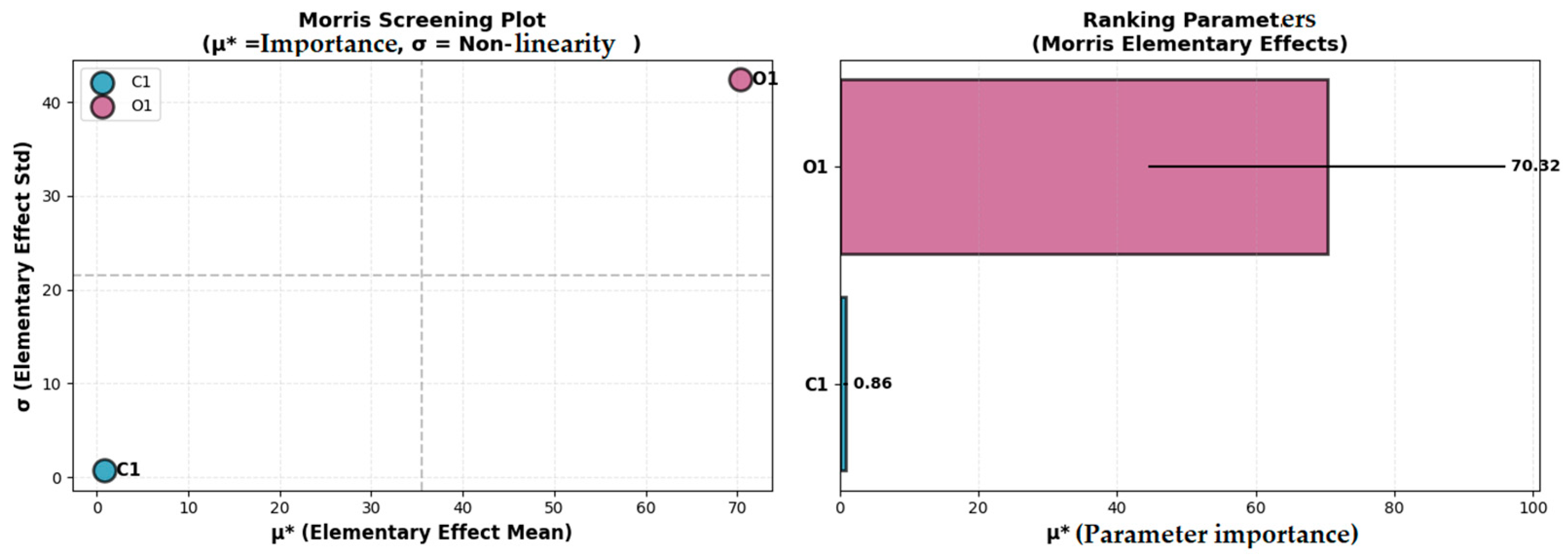 | Morris screening | Morris method | , relative importance | O1 parameter: Relative importance: 98.79%; μ* = 70.32 µS/cm (strong effect); σ = 42.41 µS/cm (moderate interactions); (Table 13) C1 parameter: Relative importance: 1.20%; μ* = 0.86 µS/cm (negligible effect); σ = 0.78 µS/cm (low interactions); (Table 13 ) |