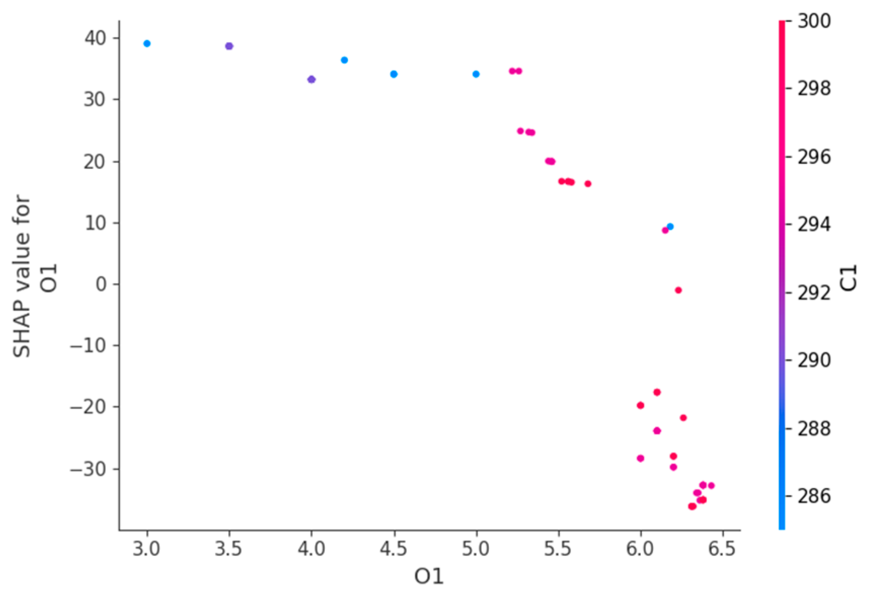 | SHAP analysis | SHAP method | ), relative importance | O1 [mg/L]: Value = 29.49 [μS/cm]; feature importance = 93.11%; (Table 16) C1 [μS/cm]: Value= 2.18 [μS/cm]; feature importance = 6.88% (Table 16) FR [L/h]: Value = 0 [μS/cm]; relative importance = 0% (Table 16) |