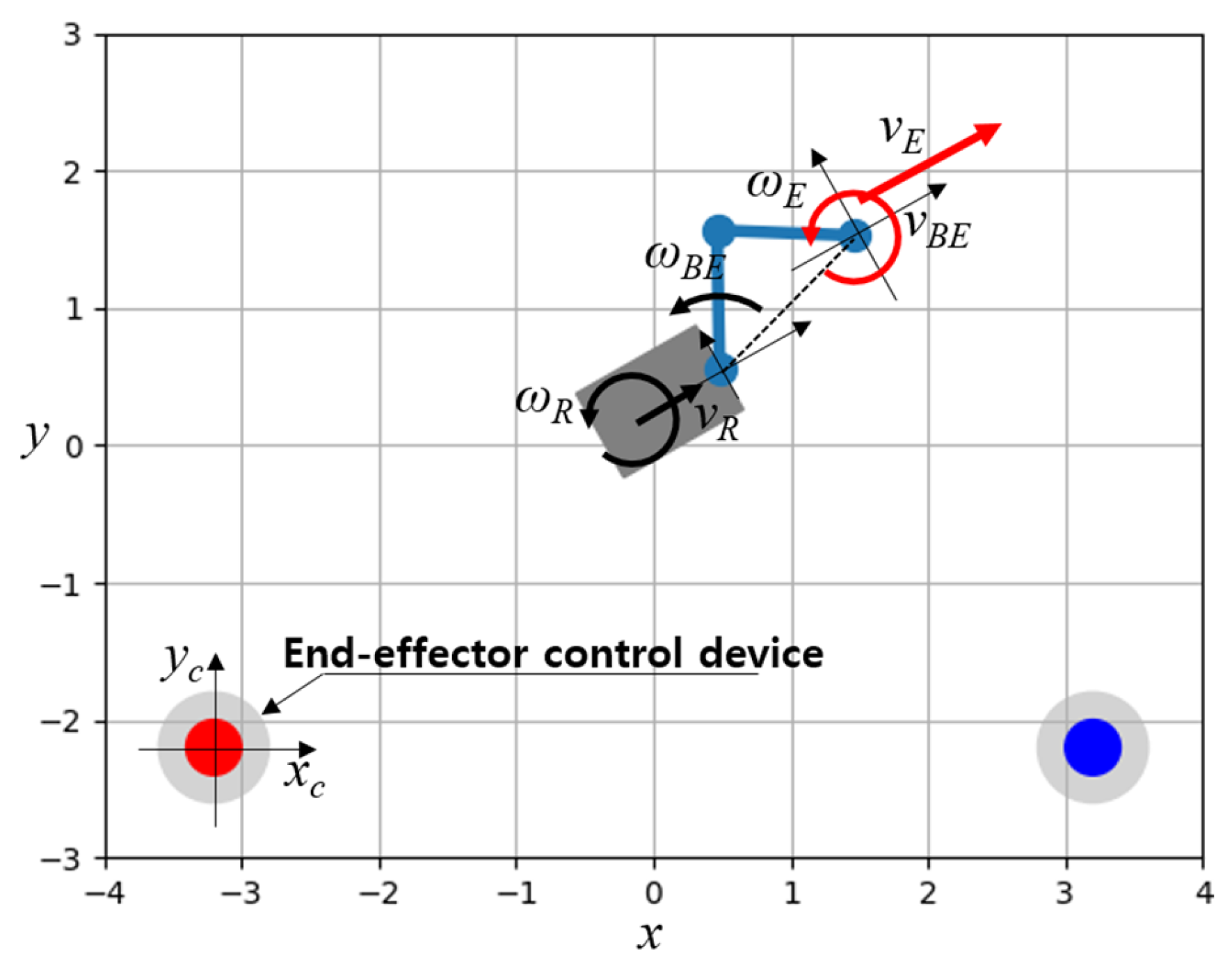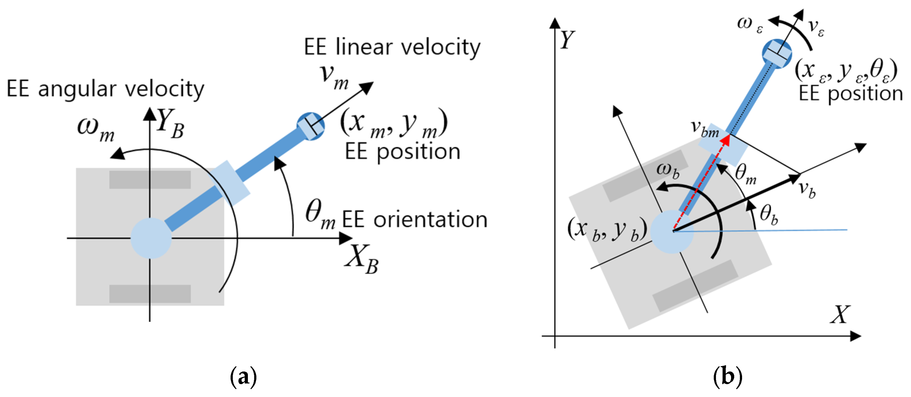 Figure 1a shows EE position and velocity information represented relative to the mobile base. Here, it is assumed that the coordinate frames of the mobile base and the manipulator are aligned. (