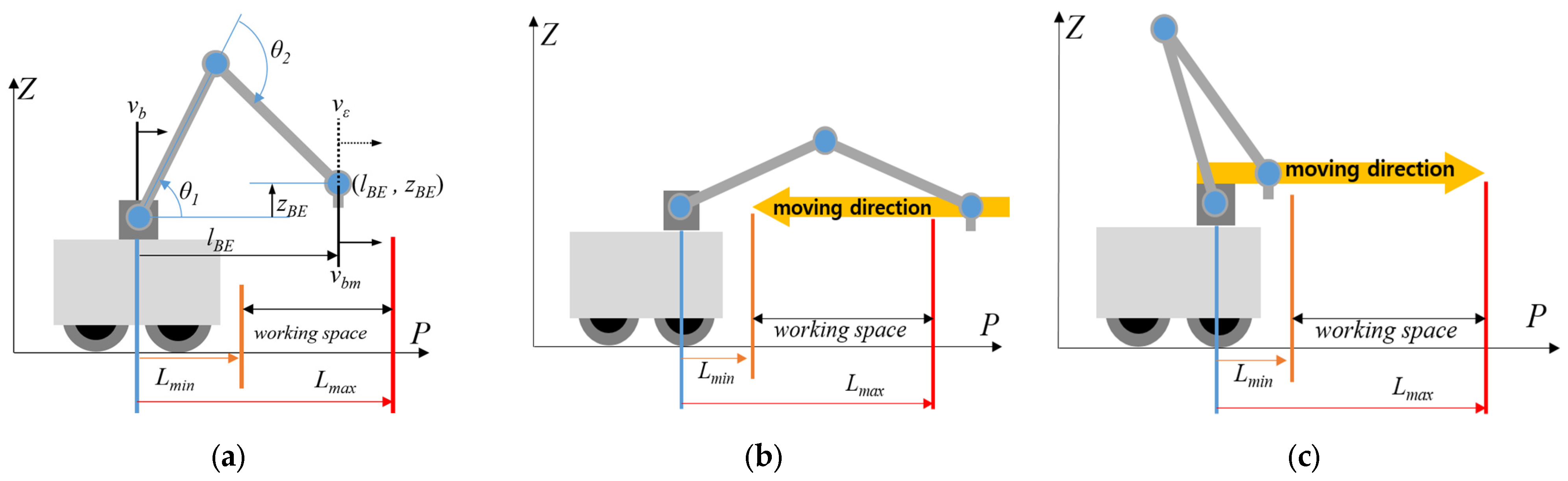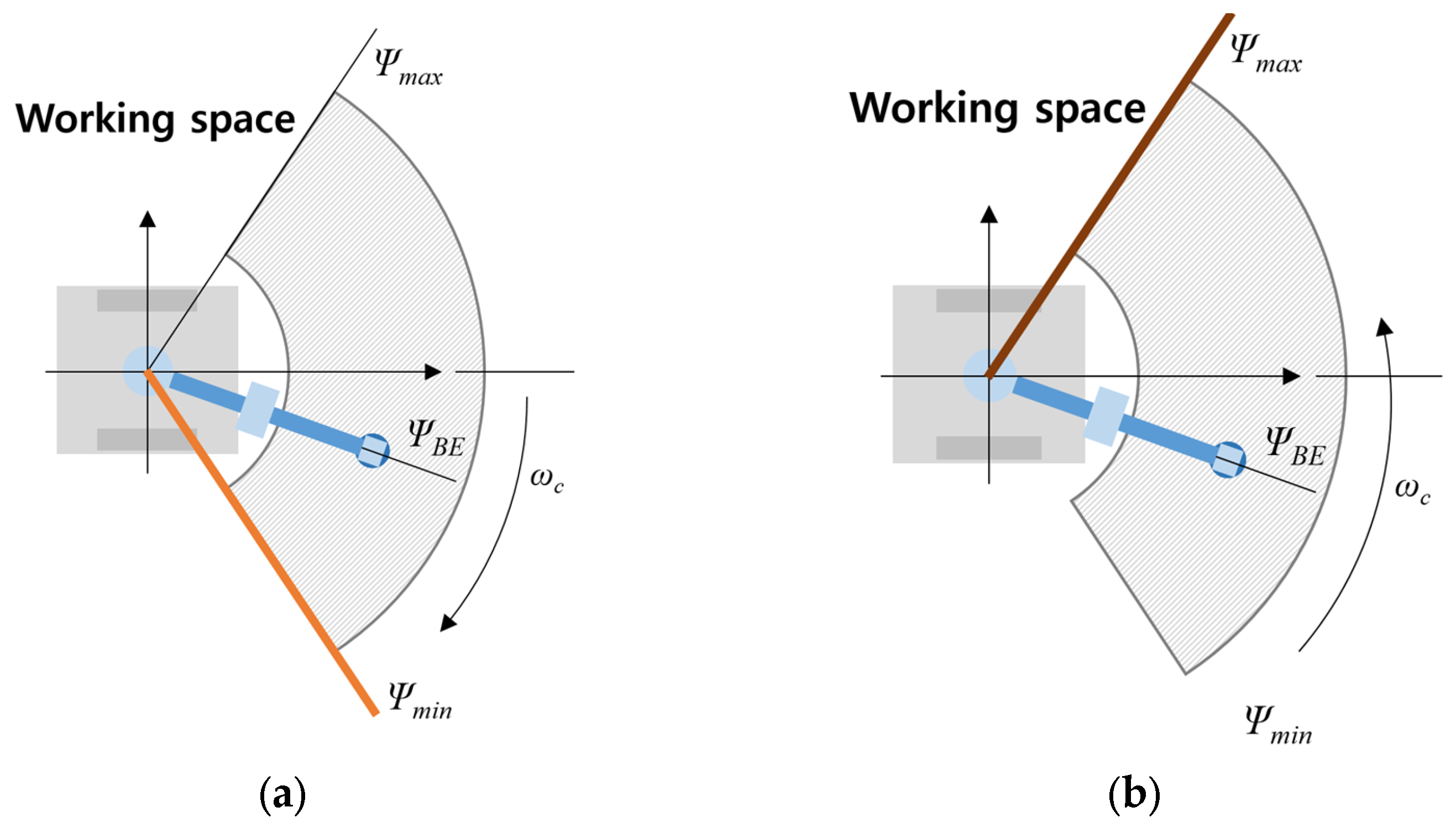 ψBE denotes the angular position of the manipulator. WS is defined by the minimum and maximum longitudinal distances of the manipulator,