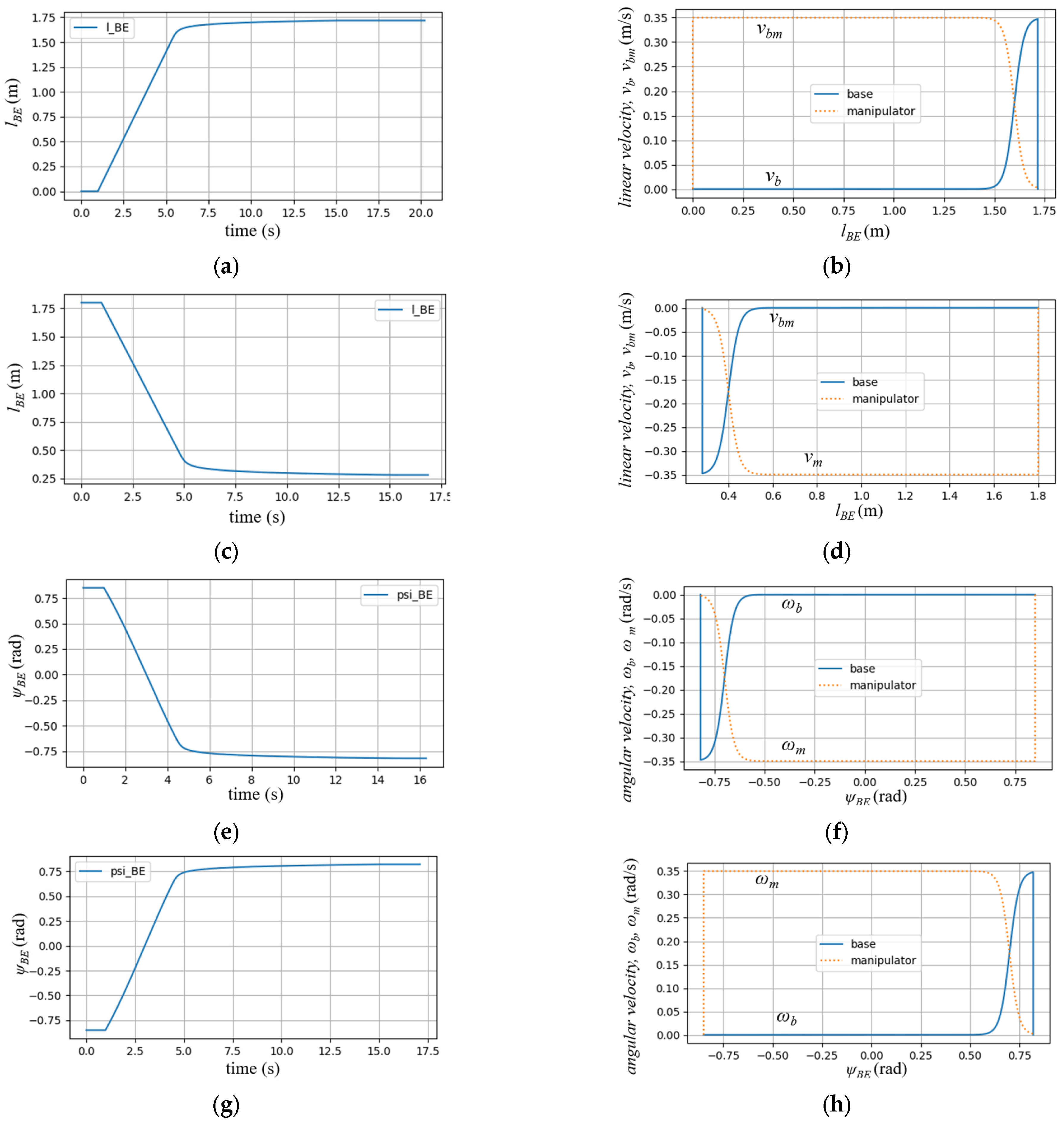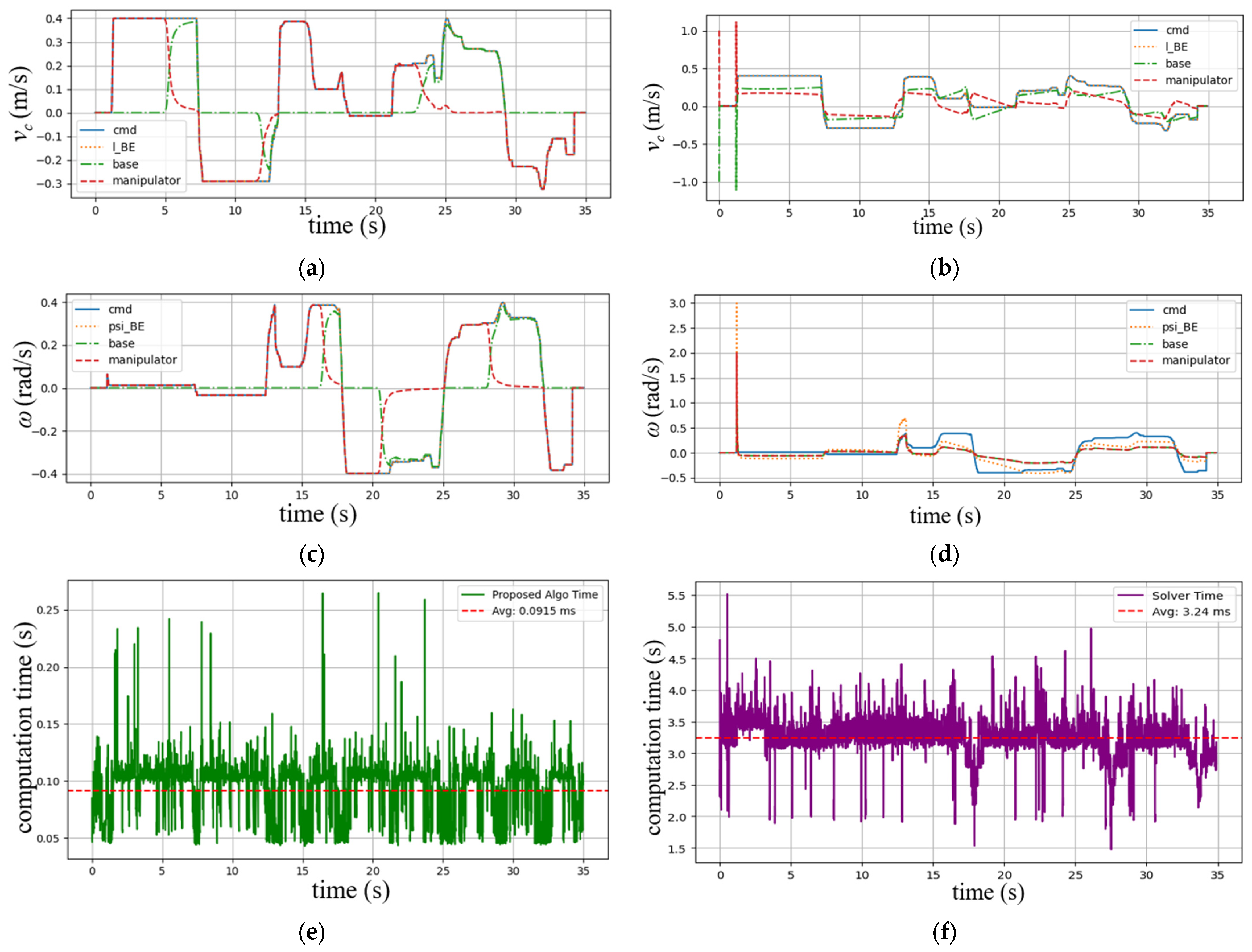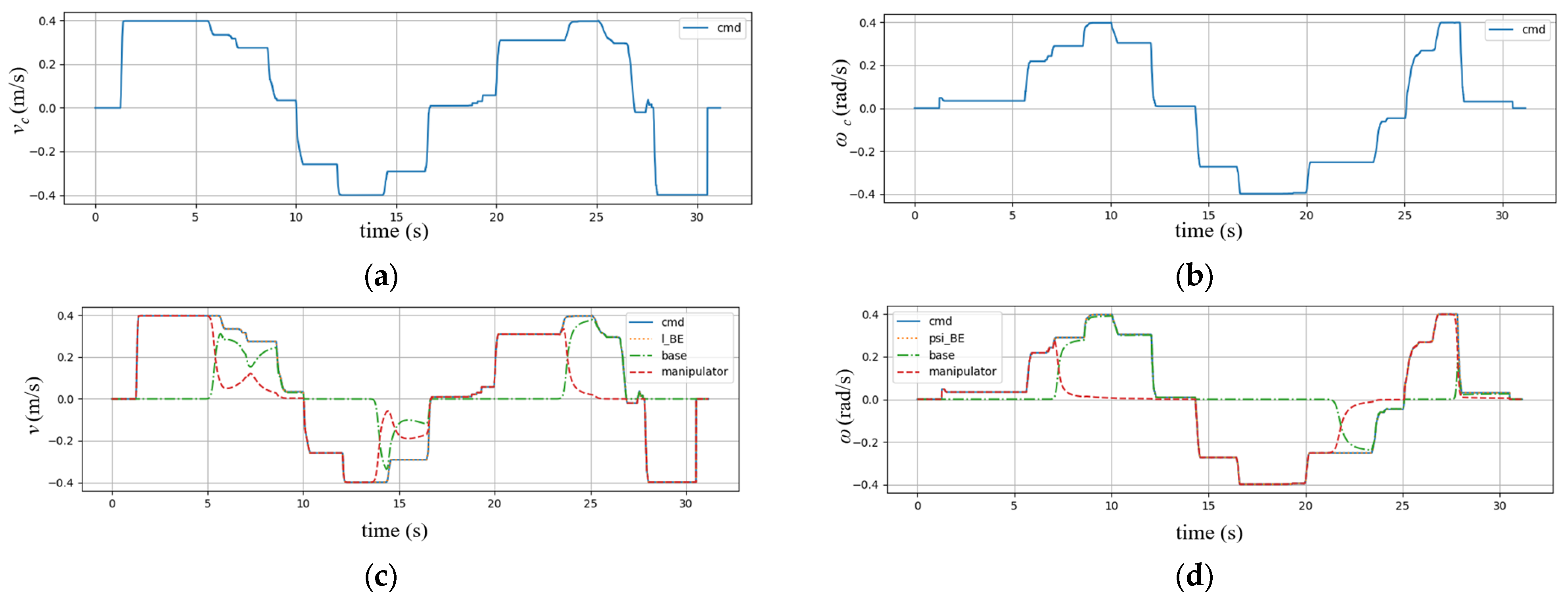 Figure 10c,d illustrate the resulting EE velocity as well as the velocities of the mobile base and the manipulator. From