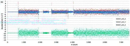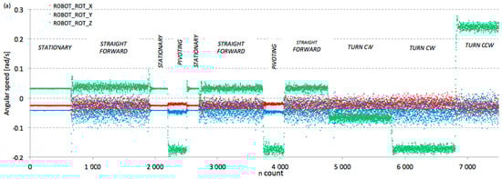 Raw data readings from IMU during mobile robot run: (a) angular speed around sensor’s axes; (b) acceleration along sensor’s axes.