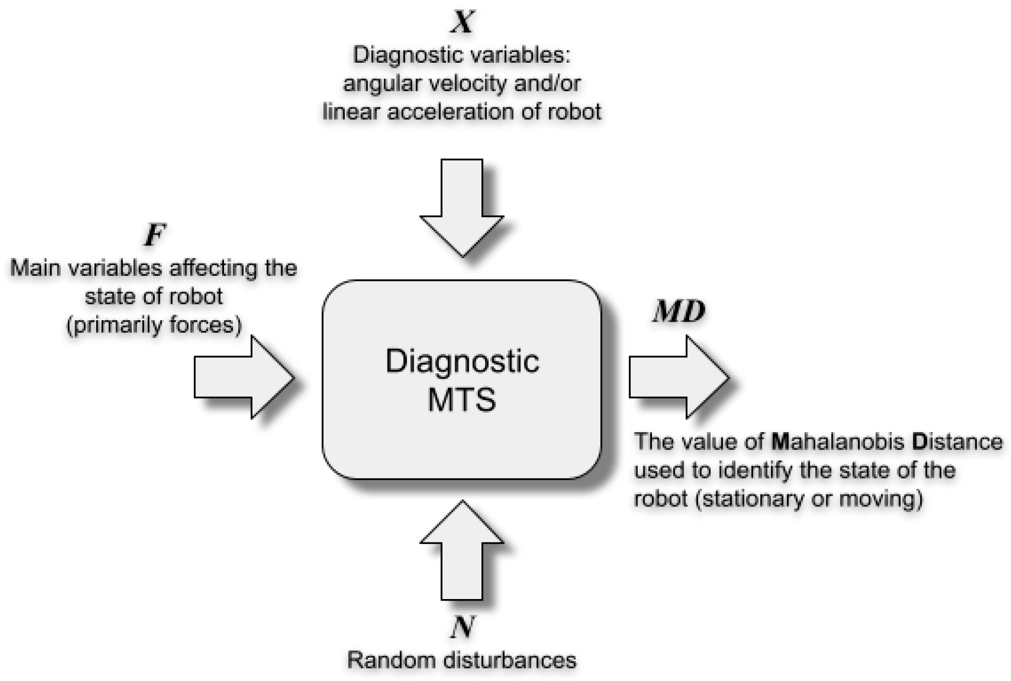 - The method is easy to automate, both in terms of constructing the MTS (as shown in Figure 2) and in terms of its subsequent numerical implementation for real-time robot state identification. The Mahalanobis distance is computed in three steps: (i) standardization of the diagnostic variables; (ii) multiplication of the resulting vector by the matrix; and (iii) comparison of the obtained value with the threshold T. The simplicity of the procedure and the modest computational requirements enable the MTS to be implemented even on microcontrollers with limited memory resources and low processing power.