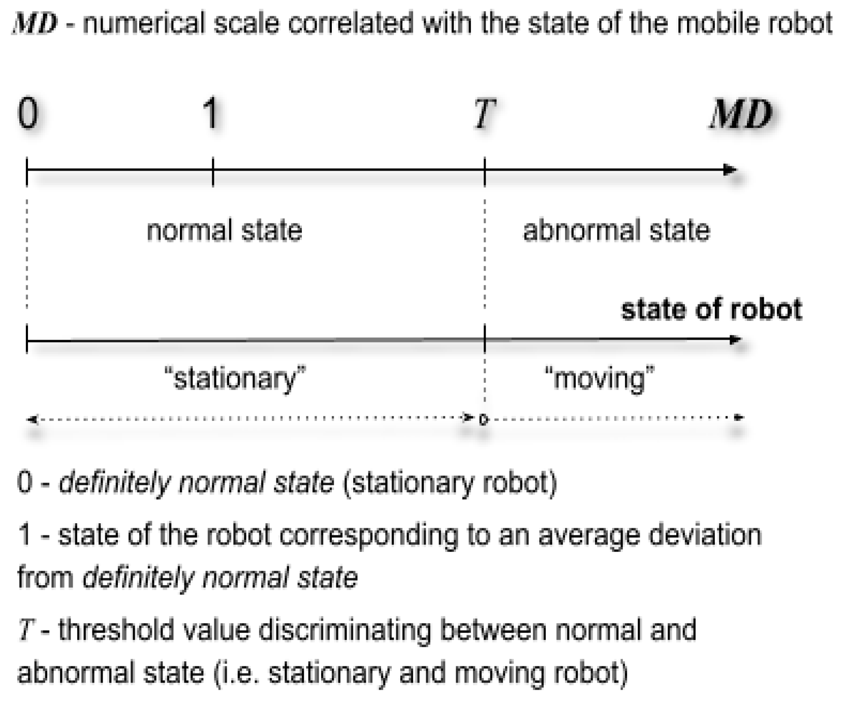 - A numerical scale was introduced, with a threshold value T, that defines the normal (stationary) and abnormal (moving) states of the object/mobile robot.