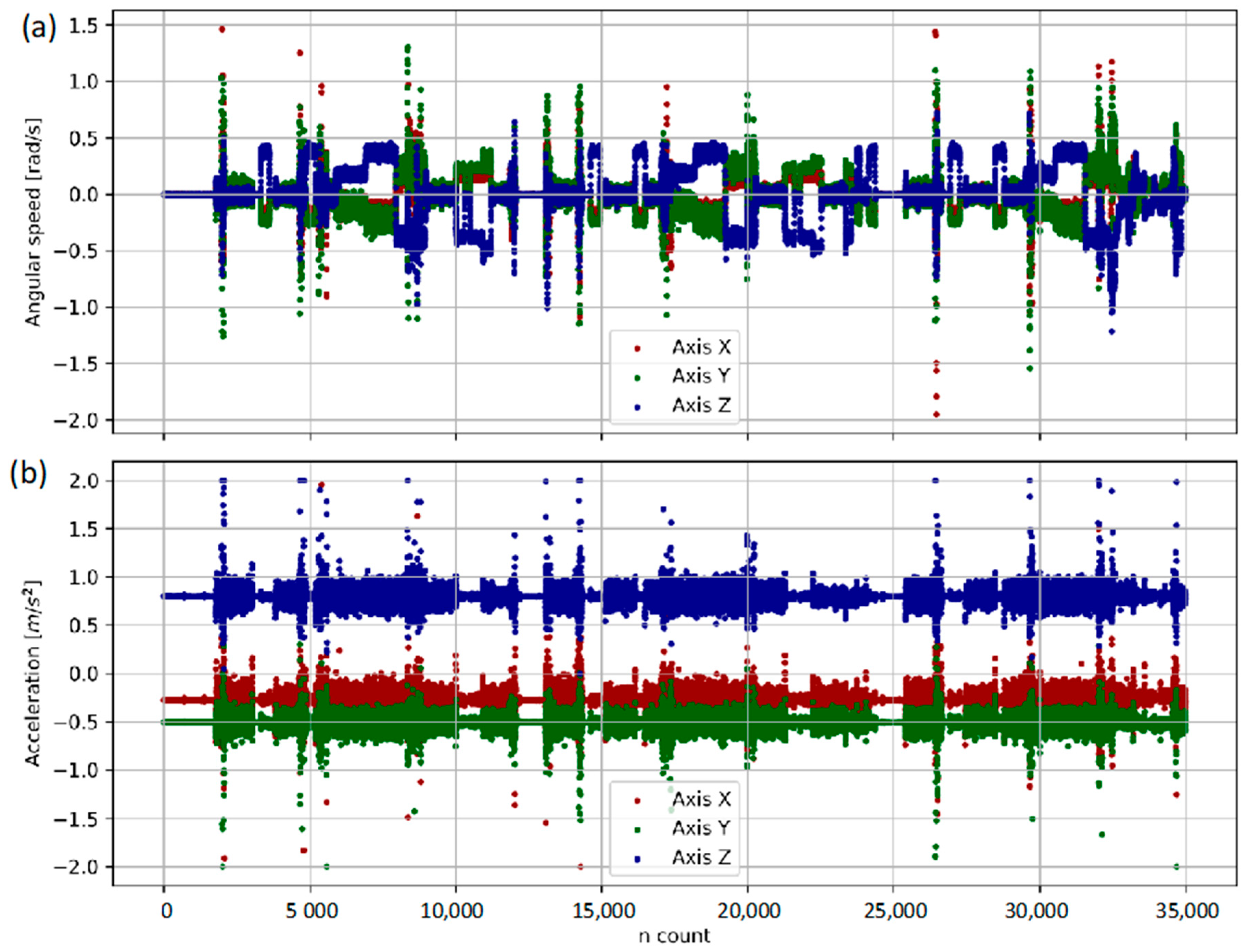 - It utilizes multiple available sources of information describing the state of the object, represented by easily measurable signals obtained from the mobile robot’s sensors. These variables may be either continuous or discrete (categorical) [32]. Although the study considered only signals provided by the IMU sensor, namely the components of angular velocity and linear acceleration, the diagnostic variables of the MTS may be extended depending on the deployment context. Such extensions may include, for example, distance measurements to objects in the robot’s surroundings and/or measurements of changes in the robot’s position relative to those objects. Increasing the diversity and quantity of such sources can therefore enhance the reliability of the detection process.