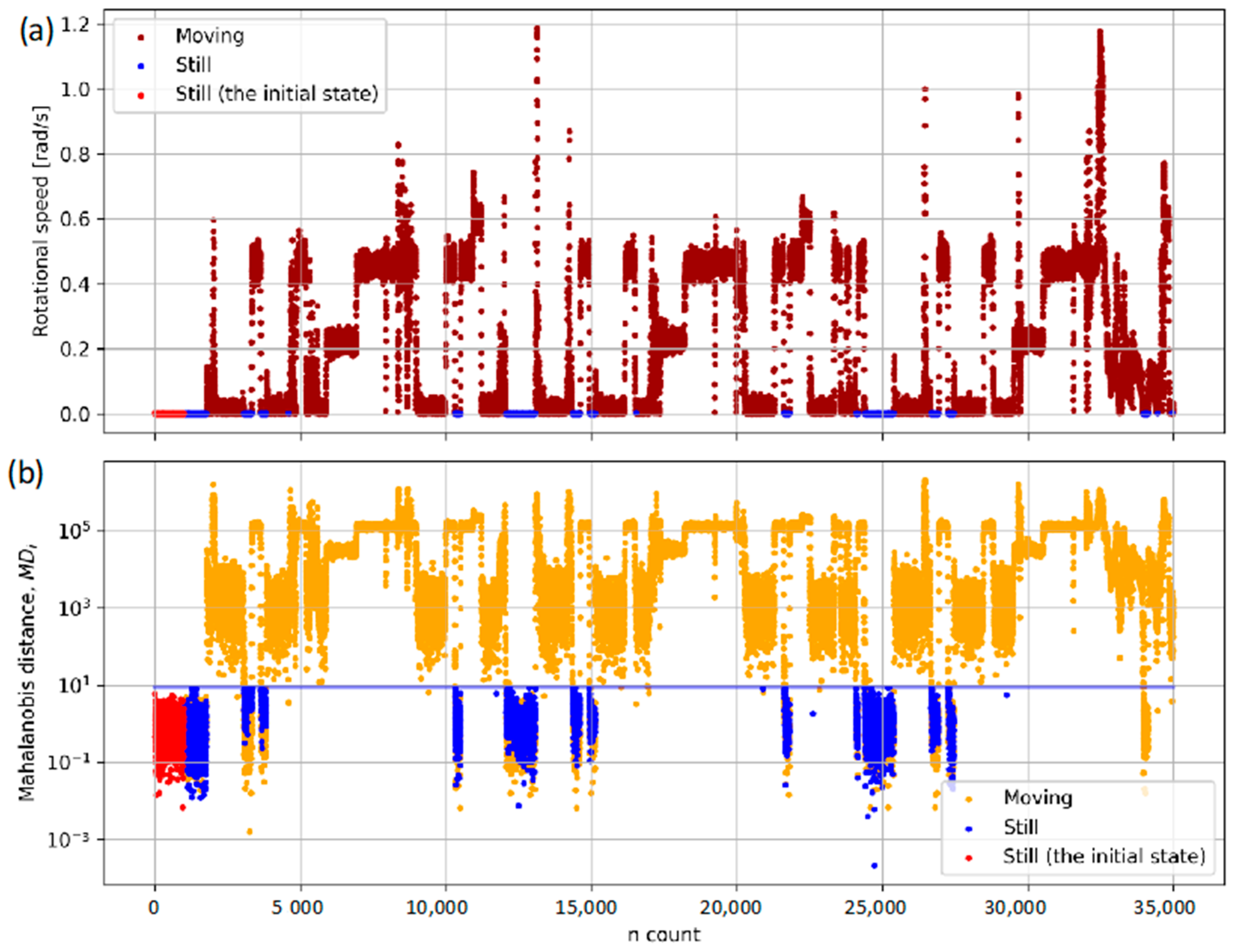 - The method accounts for the interdependencies between the diagnostic variables by computing the inverse covariance–variance matrix C−1. Incorporating the correlations among the relevant variables enhances the detection of abnormal states. Additionally, the method enables a reduction in the number of variables through vector-basis orthogonalization (the MTGS method [4]). This facilitates the integration of measurement results, for example, from multiple IMU sensors, which are inherently correlated. Such integration may, in turn, lead to an improvement in stationary-state detection accuracy.