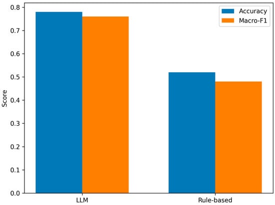 Comparative performance of the LLM-assisted approach and the rule-based baseline.