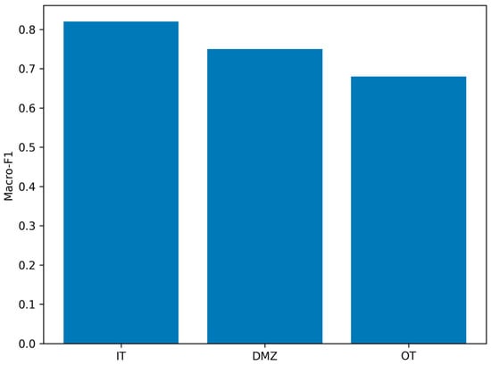 Analysis of the results taking into account network architecture segments indicates a different effectiveness of classification depending on the location of the incident (Figure 5). The best results were obtained for the IT segment, where the availability of diagnostic data and logs is the highest. Slightly lower efficiency in the DMZ confirms its role as an intermediate area, connecting the IT and OT worlds. The lowest values of effectiveness measures were recorded in the OT segment, which can be associated with limited observability of events, restrictive rules for interference with production systems, and the specificity of data generated by industrial automation and IIoT devices. The exact Macro-F1 values obtained for individual network segments are summarized in Table 2.