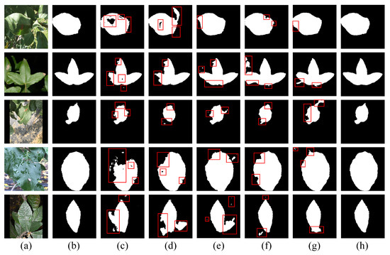 Visual comparisons of this ablation study illustrate the impact of each component on segmentation performance. As shown in Figure 8, the Baseline produced incomplete masks and failed to delineate fine-grained leaf boundaries in cluttered scenes. The introduction of HEFM preserved high-frequency edge details lost during encoding stage, which resulted in more coherent contours around individual leaves. The introduction of SRAM mitigated structural fragmentation by eliminating false positives and enhancing spatial continuity during the decoding stage. When both modules were combined in EHPNet, the segmentation results exhibited improved completeness, cleaner contours, and more accurate separation of overlapping regions. These visual outcomes align closely with the quantitative improvements presented in Table 5, which confirms the effectiveness of HEFM and SRAM in addressing the challenges of complex field environments.