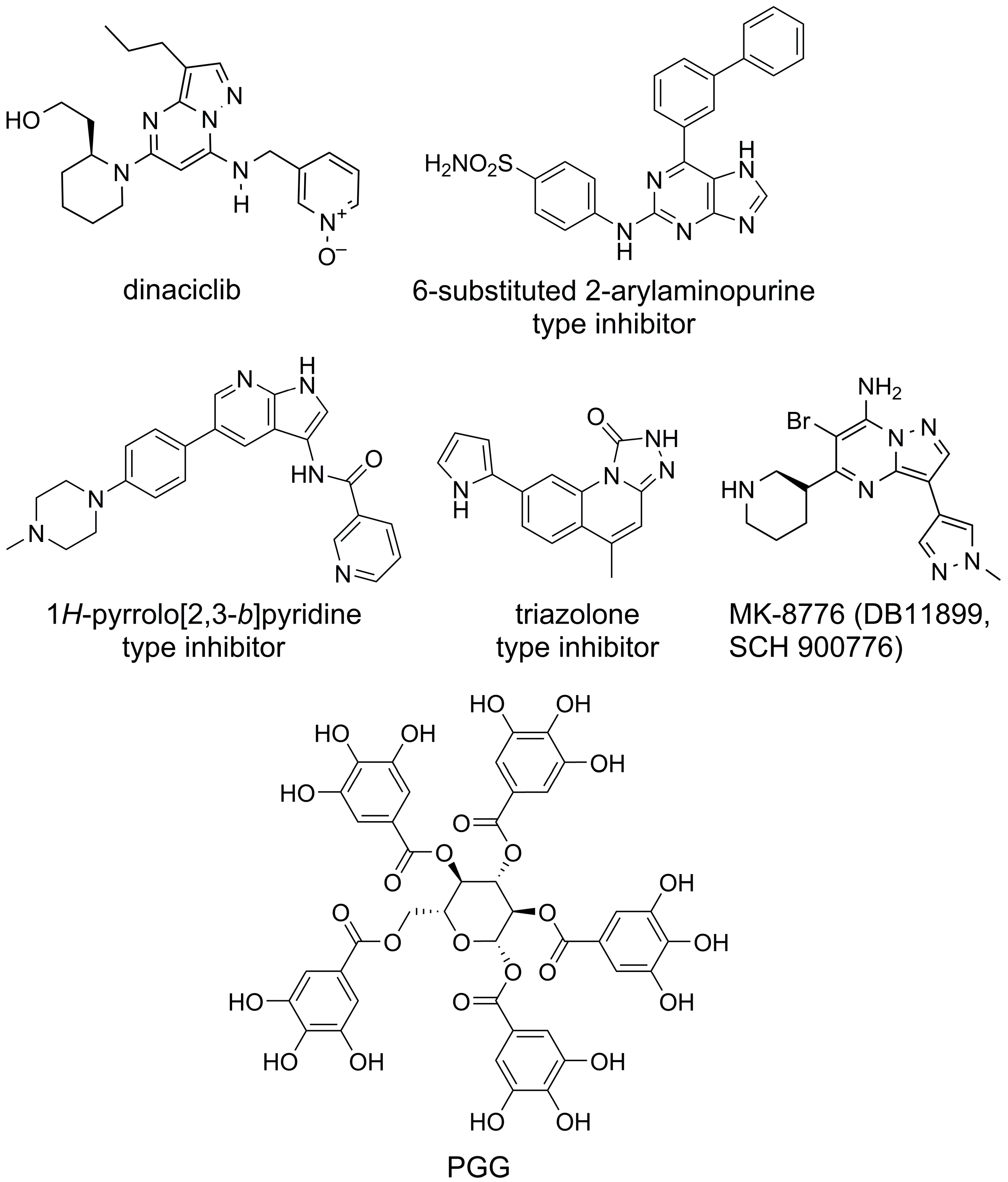 Molecular docking method was used to explore the potential binding affinity of penta-O-galloyl-β-D-glucose (PGG), as an important representative of hydrolysable gallotannins found in the extracts from C. coggygria, into the ATP-binding sites of cyclin-dependent kinase 2 (CDK2) and checkpoint kinase 1 (Chk1). The crystal structures of the CDK2 and Chk1 were retrieved from the Protein Data Bank (PDB) [21]. When selecting the three-dimensional structures of the enzymes for modeling, we based our choice on two principles: crystal structures with different ligands, including inhibitors or activators of the corresponding enzyme, and the highest possible resolution of protein structures (Table 1). Pubchem (CID 65238) was the source of PGG structure, which was generated as a sdf (structure data file). For the purpose, a SMILES code (Simplified Molecular Input Line Entry System) obtained by the program BIOVIA Draw v21.1 from the sdf file was applied [22]. Highly effective and selective inhibitors of the two enzymes were used as positive controls for docking studies. Dinaciclib is a highly potent CDK2 inhibitor with an IC50 = 1 nM, which is in phase 2 clinical trials for melanoma [23,24]. The Chk1 inhibitor MK-8776 (DB-11899; SCH 900776) has an IC50 = 3 nM, is specific to this enzyme compared to Chk2 and is in phase 2 clinical trials [25]. The inhibition of Chk1 was supposed to result in tumor cells bypassing Chk1-dependent cell cycle arrest and a block of cell cycle in S and G2/M phases [26]. Chemical structures of PGG, as well as those of different ligands (including inhibitors) used as positive controls in the crystal structures of enzymes, are shown in Figure 1.