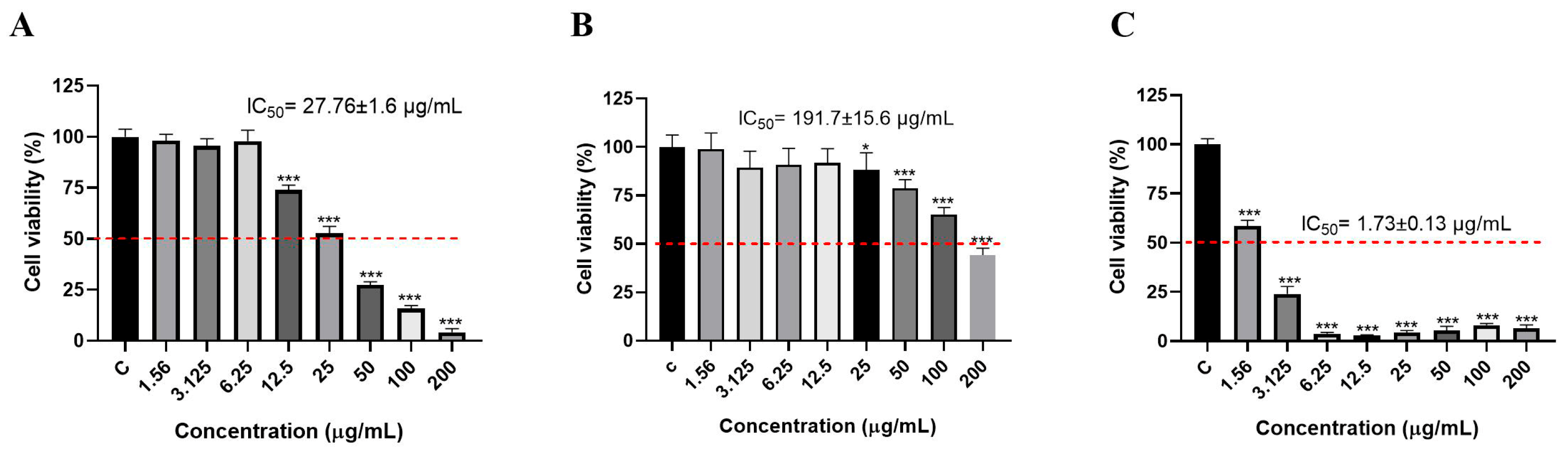 Figure 3. Cytotoxic effect of the tested extract on BALB/3T3 cells determined by the NRU assay. Cell viability is expressed as a percentage of untreated control (C). Data are shown as mean ± SD (n = 3). * p < 0.05, *** p < 0.001 vs. control. The dashed line indicates 50% viability.