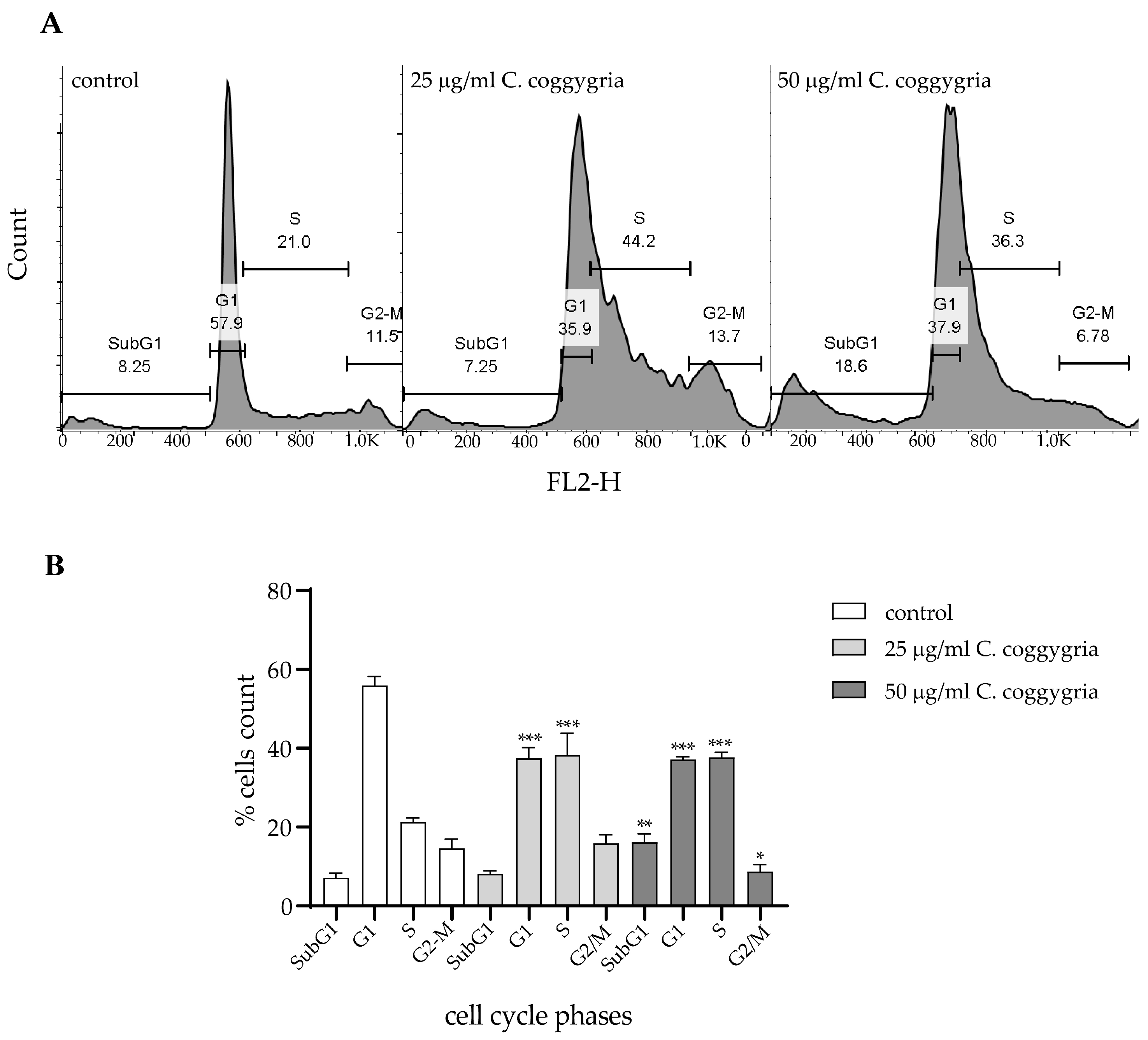 Figure 6. Effects of the ethyl acetate/water (pH 3.0) extract from C. coggygria on the cell cycle distribution of HepG2 cells, assessed by FACS analysis. (A) Representative histograms of untreated control cells and cells treated with 25 µg/mL or 50 µg/mL of the extract. (B) Bar graph summarizing the percentages of cells in each phase of the cell cycle, based on three independent experiments. * p < 0.05, ** p < 0.01, *** p < 0.001.