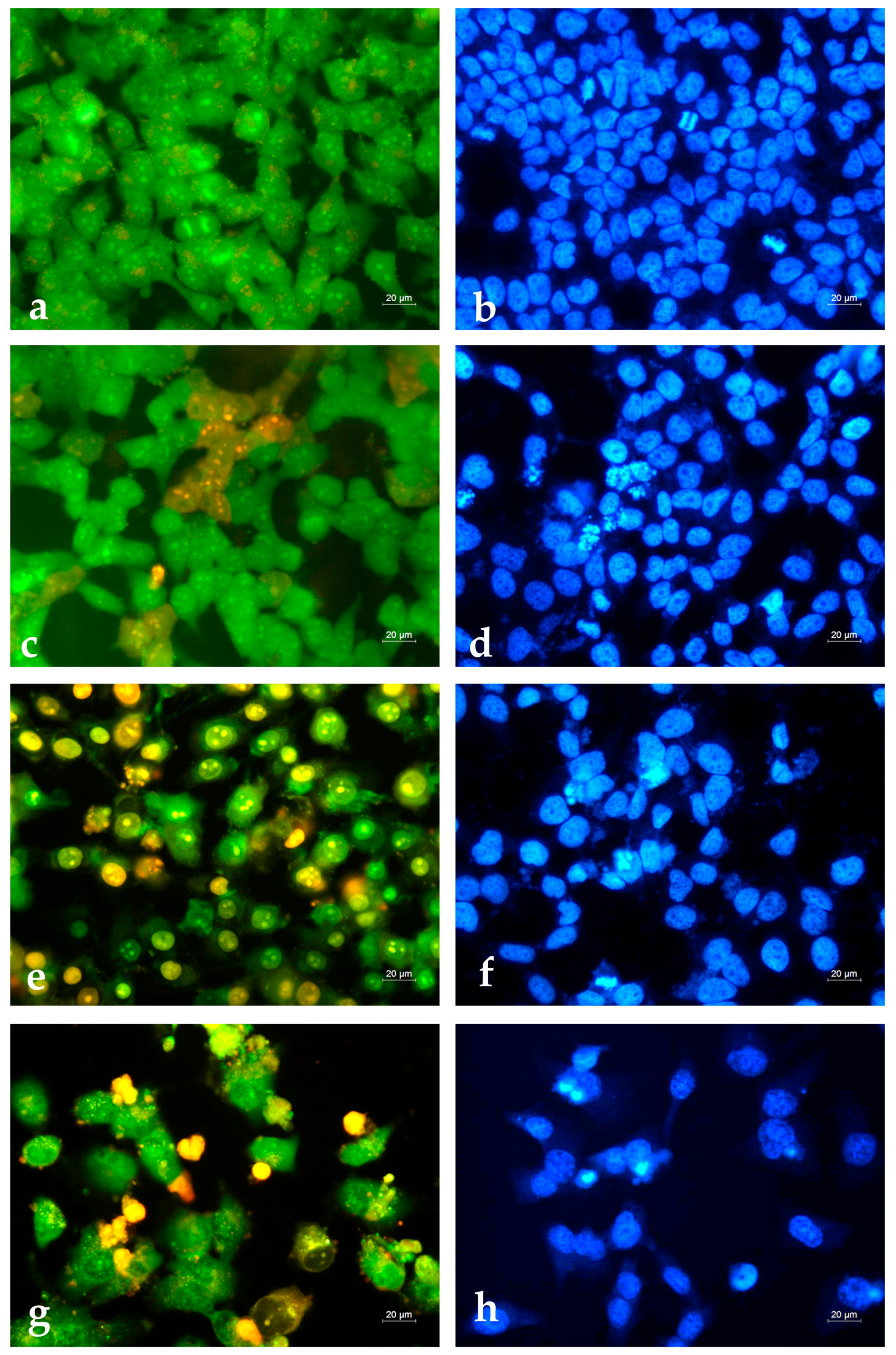 Figure 7. Cytomorphological changes in HepG2 cells induced by the ethyl acetate/water (pH 3.0) extract of C. coggygria. Cells were untreated (negative control, (a,b)), treated with 25 µg/mL extract (c,d), 50 µg/mL extract (e,f), or 2 µg/mL doxorubicin (positive control, (g,h)). AO/EB staining images are shown in panels (a,c,e,g); DAPI staining images are shown in panels (b,d,f,h). Fluorescence microscopy, 40× objective.