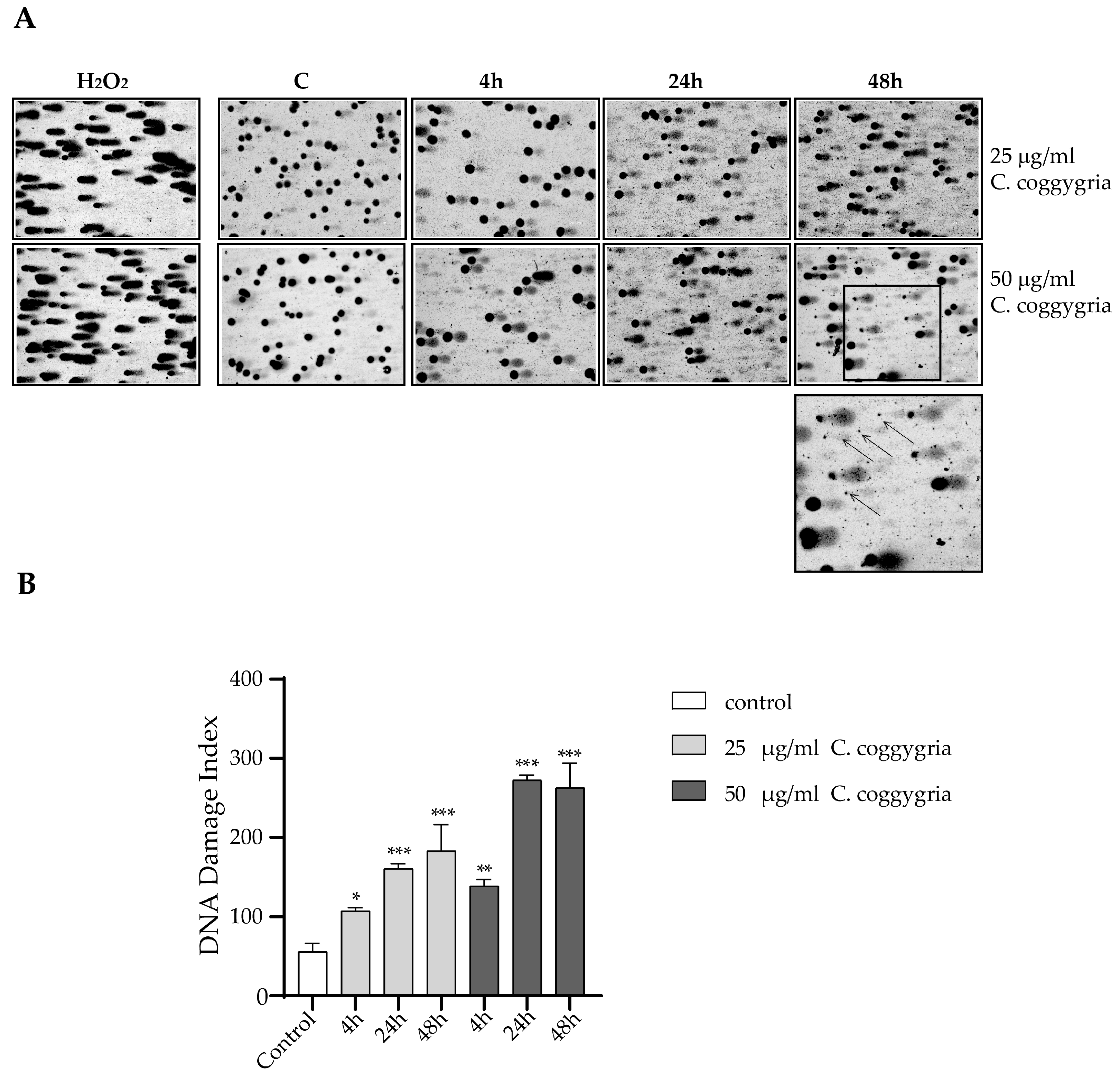 Figure 9. Estimations of the extent of DNA damage in HepG2 cells treated with the extract, by using the comet assay in alkaline conditions. (A) Microphotographs of DNA fragmentation; from left to right: positive control (cells treated with H2O2), untreated cells; cells treated with the extract for 4 h, 24 h and 48 h; (B) calculated DNA damage index, presented as mean ± SD from three independent experiments. Standard deviation is shown with error bars; * p < 0.05, ** p < 0.01, *** p < 0.001.