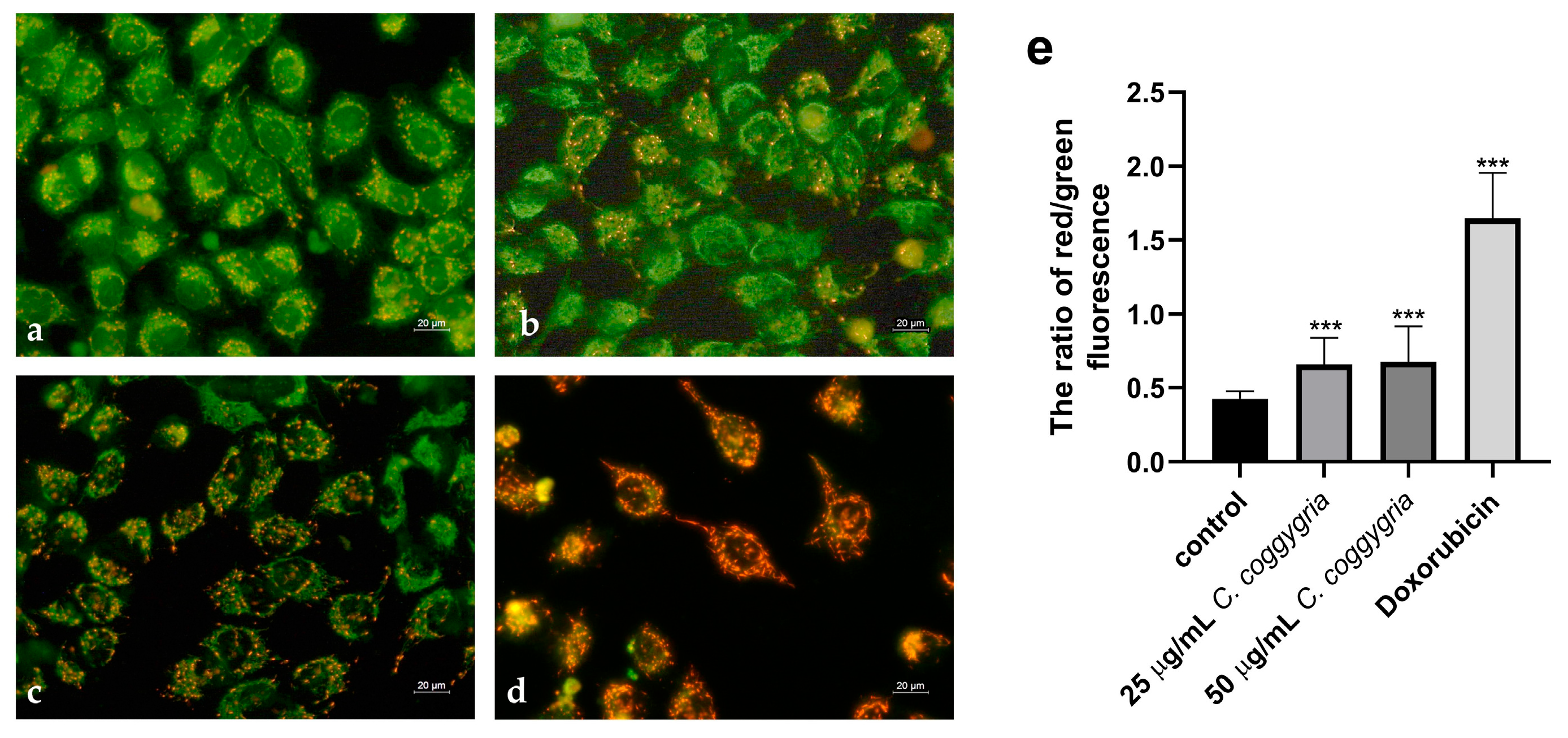 Figure 10. Assessment of mitochondrial membrane potential in HepG2 cells by JC-1 staining after treatment with C. coggygria extract. Cells were untreated (a), treated with 25 µg/mL extract (b), 50 µg/mL extract (c), or 2 µg/mL doxorubicin ((d), positive control). Panel (e) shows the quantitative analysis of the red/green fluorescence ratio. Data are given as mean ± SD from three independent experiments. Statistics: one-way ANOVA, followed by Bonferroni test, *** p < 0.001 compared to the untreated control. Red fluorescence indicates polarized mitochondria (JC-1 aggregates), and green fluorescence indicates depolarized mitochondria (JC-1 monomers). Scale bar = 20 µm.