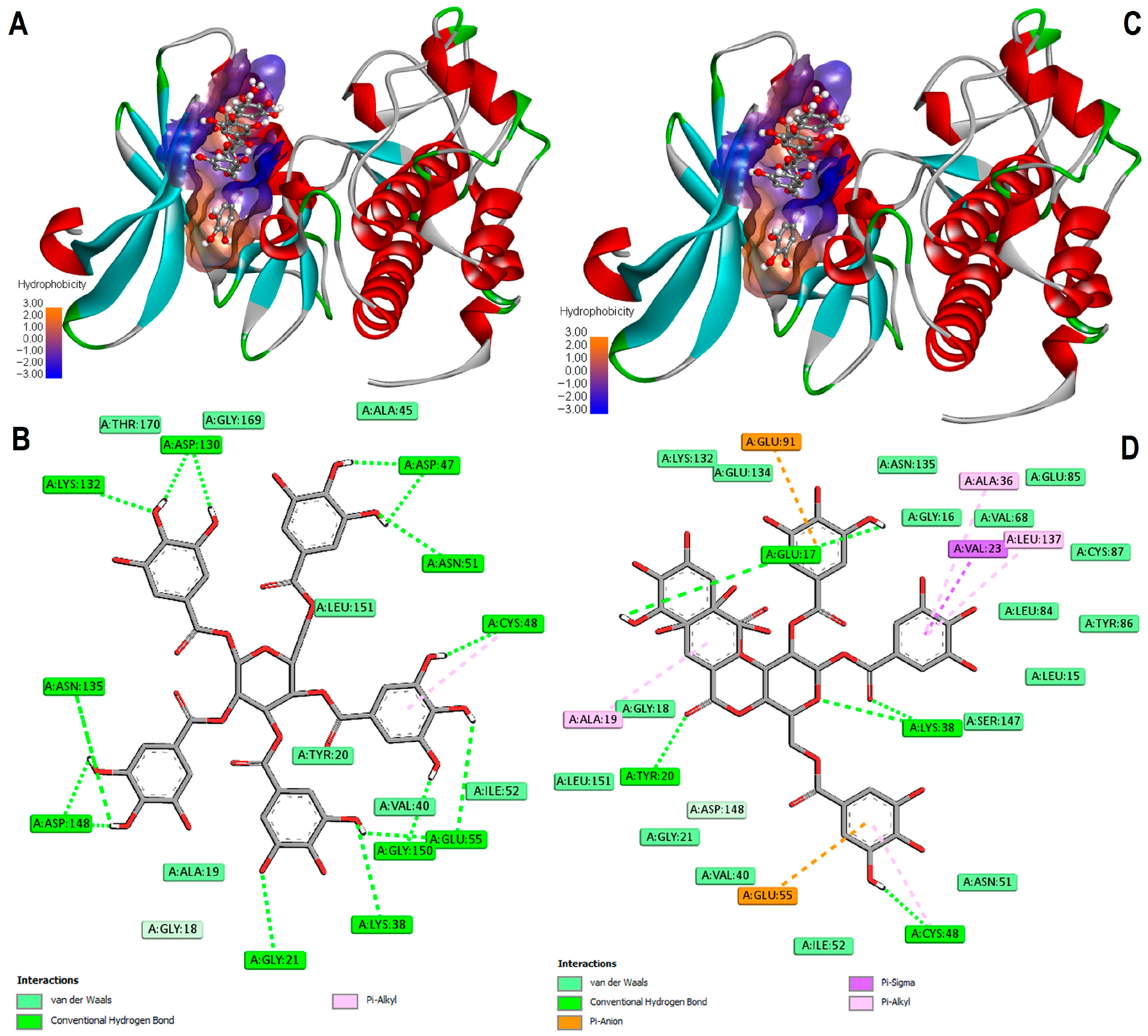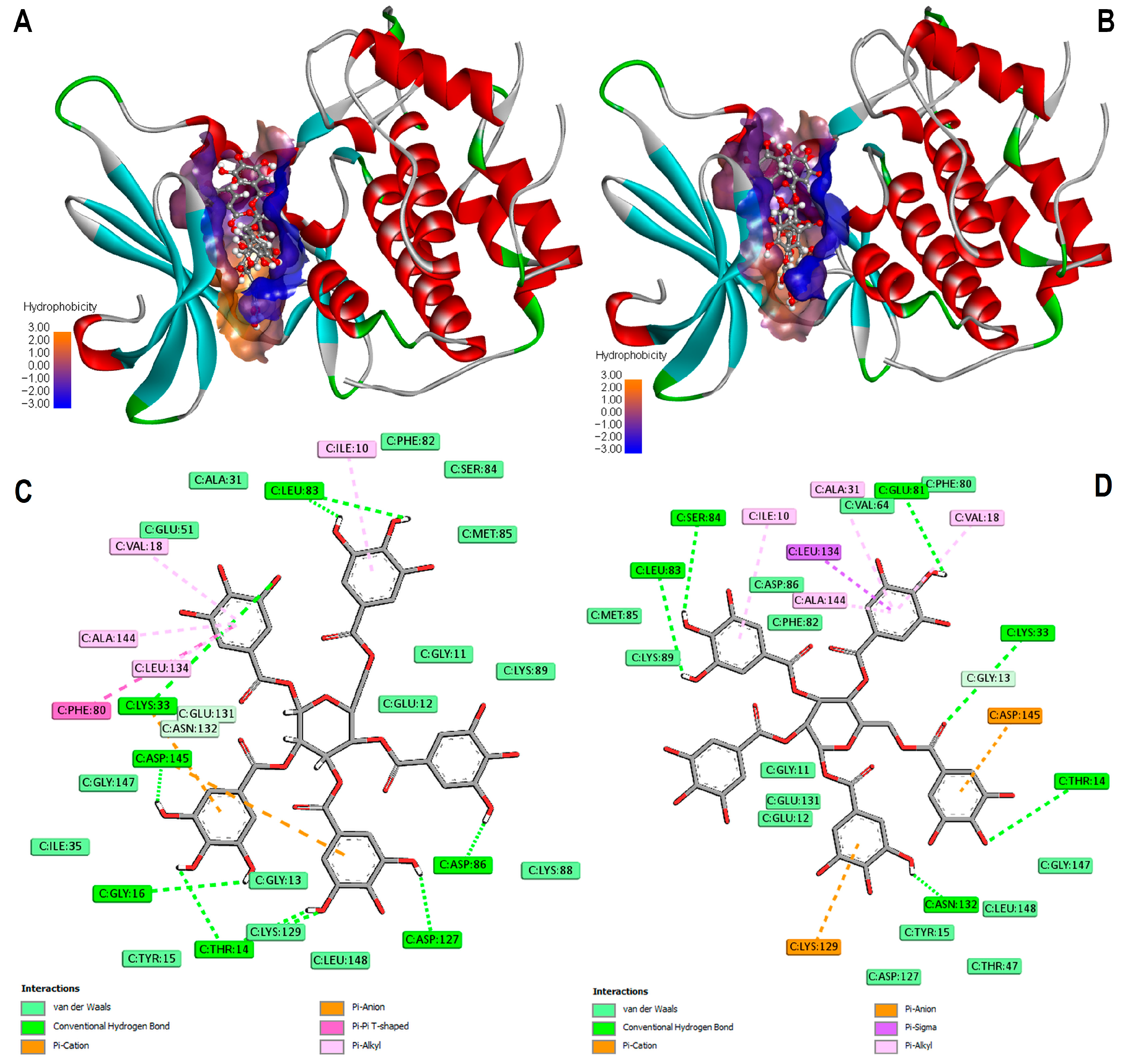 Figure 11. Docking results for the PGG in CDK2 (PDB ID: 4EOM) ATP-binding site. Ribbon diagram depicting the crystal structure of the protein. Enzyme surface in contact with ligand is colored by hydrophobicity. PGG is shown as ball and sticks colored. Panels (A,B) displays the binding of PGG in active site of CDK2, generated using docking tools SwissDock2 and CB-Dock2, respectively. The relevant 2D models for molecular interactions of PGG with enzyme are presented in panels (C,D). Visualized using BIOVIA Discovery Studio Visualizer v25.1.0.142884.
