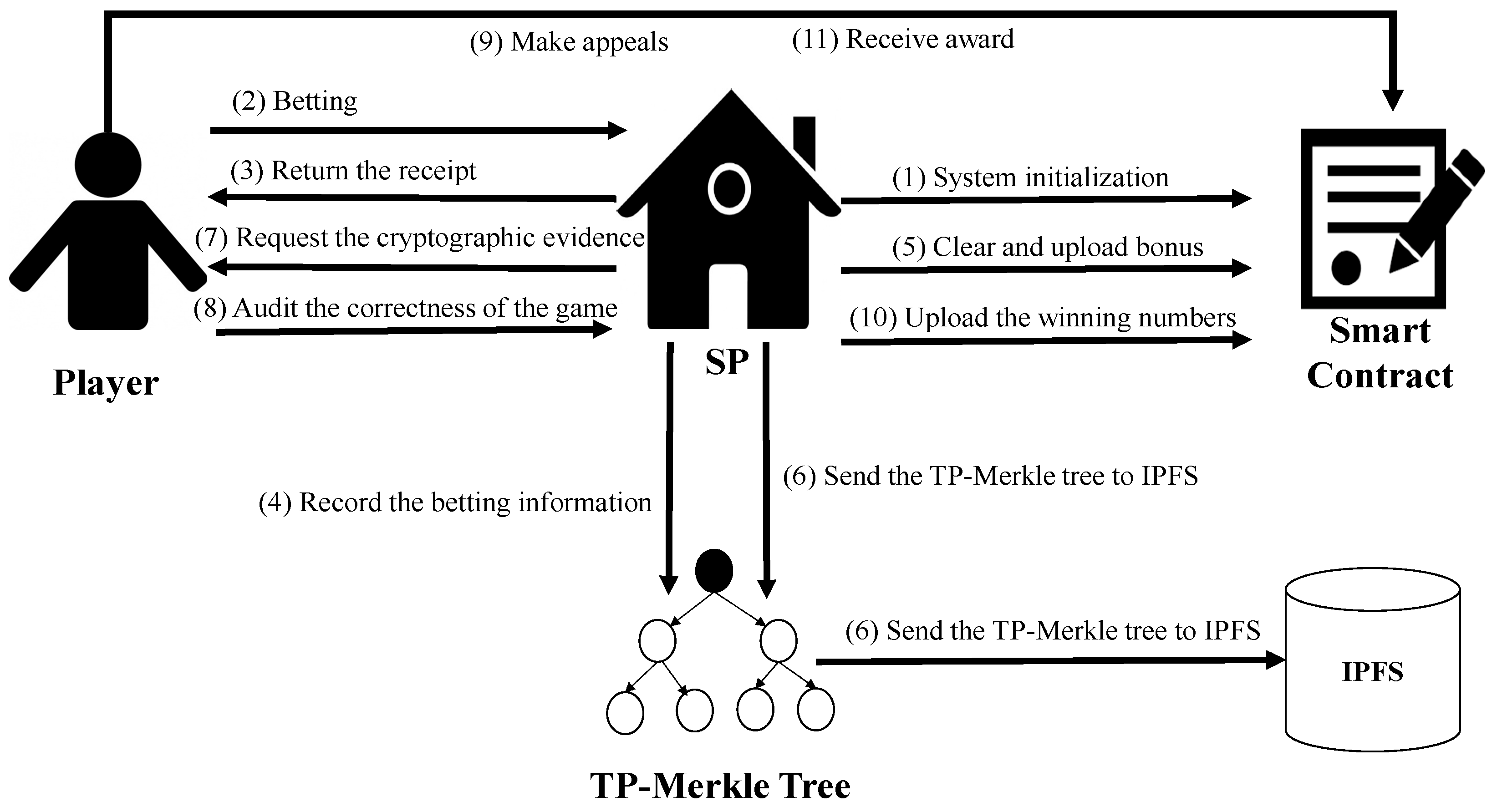 - Hybrid on-chain/off-chain architecture: We propose a scalable lottery system that stores millions of bets off-chain in a TP-Merkle tree, while committing only compact per-round Merkle roots to the public blockchain. This substantially reduces on-chain bandwidth and storage requirements without compromising auditability.