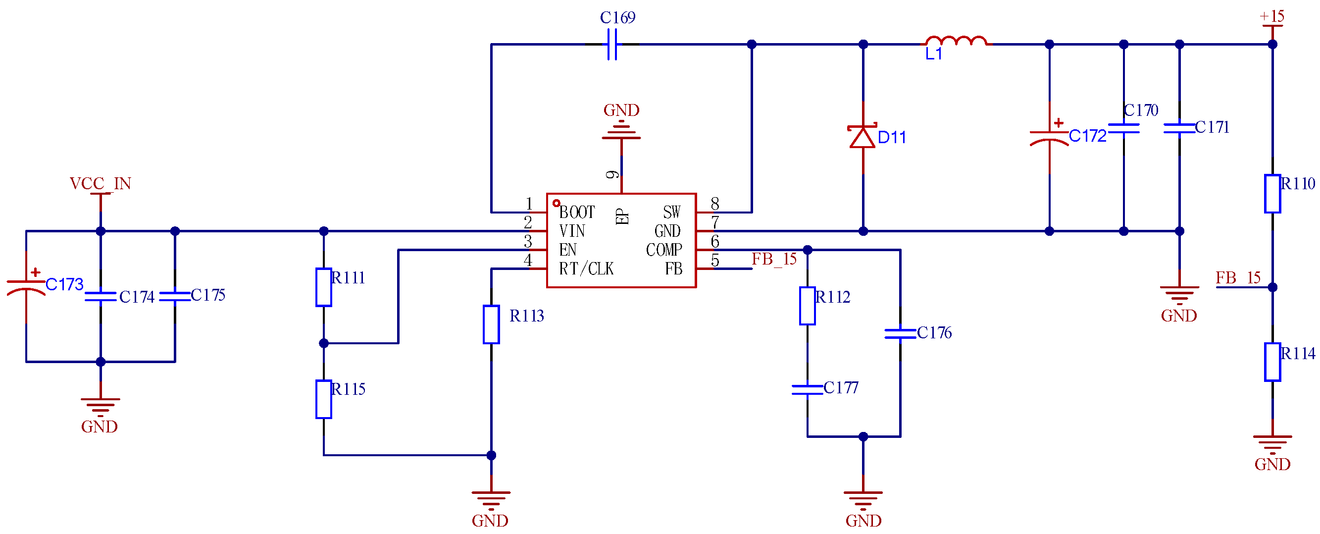 Input voltage Vin passes through input filter capacitors before entering the Buck converter integrated circuit (IC). C173 is a large electrolytic capacitor responsible for providing voltage buffering for the IC. Parallel capacitors C174 and C175 are small ceramic capacitors used to reduce equivalent series resistance (ESR) and filter high-frequency noise from the input voltage, thereby reducing ripple voltage. R111 and R115 form a voltage divider network connected to the IC’s enable (EN) pin, controlling its enable and disable state. C169 is the bootstrap capacitor for the internal metal-oxide-semiconductor field-effect transistor (MOSFET), providing the gate drive voltage. R112, C176 and C177 form the loop compensation network to ensure stability. R110 and R114 form the output voltage feedback divider network, sending a negative feedback signal to the internal feedback input (FB) pin, which works with the internal reference voltage to regulate the output voltage. C172, C170 and C171 are output filter capacitors, serving a similar purpose as the input capacitors—stabilizing the output voltage and reducing ripple. Inductor L1 serves as the energy storage element, utilizing the principle that inductor current cannot change instantaneously; it charges and discharges cyclically through the switching action of the internal MOSFET, providing energy to the subsequent stage. To reduce ripple voltage, the design considerations include appropriately increasing output capacitance while decreasing ESR, and increasing the switching frequency and the value of L1.