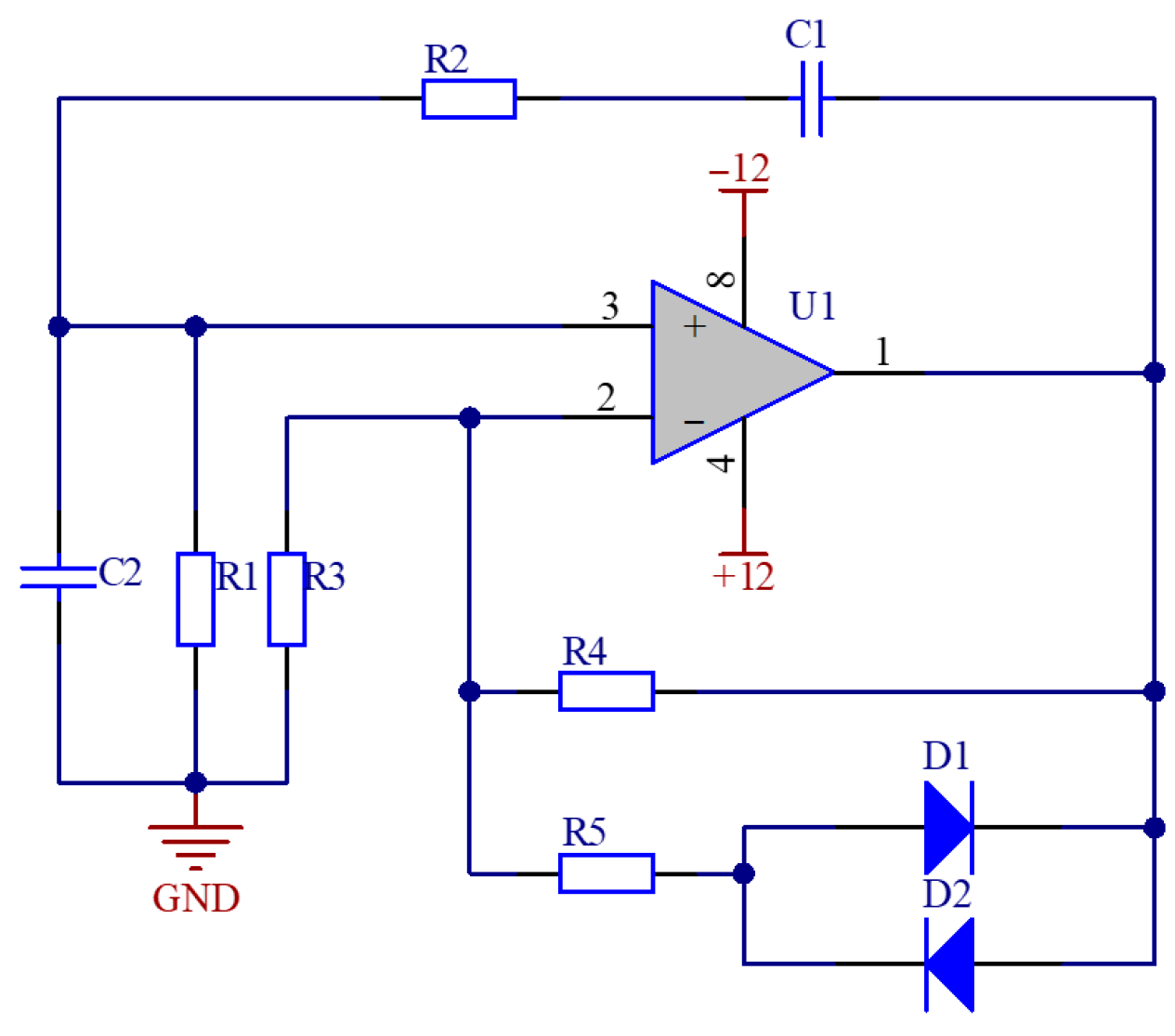 When the circuit gain is greater than 3, positive feedback dominates, causing the circuit to oscillate but unstably, with oscillations growing continuously. When the gain is less than 3, negative feedback dominates, and the circuit fails to oscillate. Only when the gain is exactly 3 does the circuit operate continuously and stably. To stabilize the amplitude, a nonlinear network composed of diodes (D1, D2) and resistor R5, is introduced into the negative feedback loop. This network dynamically adjusts the feedback factor, keeping the circuit operating at the critical state, resulting in a sinusoidal wave output with low harmonic distortion and stable frequency.