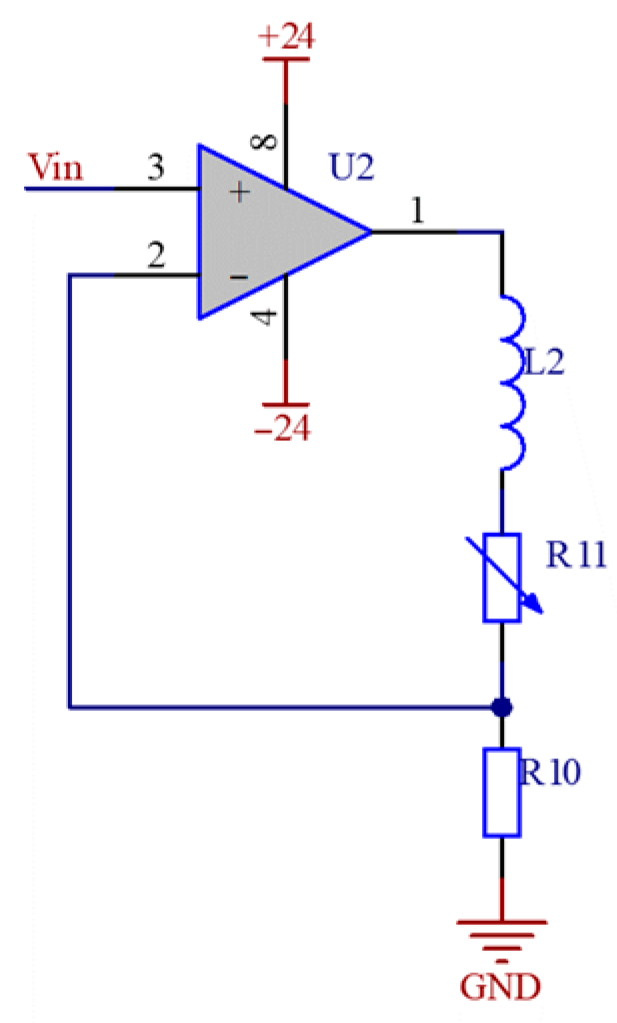 Based on the operational amplifier’s “virtual short and virtual open” principles, . The current flowing through the sense resistor R10 and the excitation coil is . This current value depends solely on the input voltage and the sense resistor R10, and is independent of the coil impedance, thereby ensuring the stability and waveform fidelity of the excitation current.